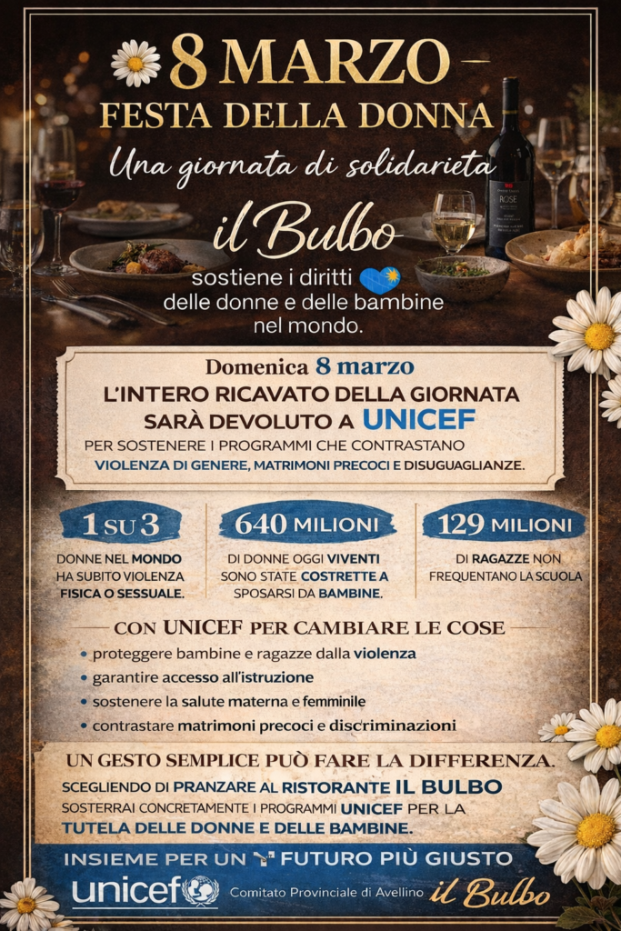 In occasione della Giornata Internazionale della Donna, domenica 8 marzo, il ristorante Il Bulbo promuove una speciale iniziativa di solidarietà: l’intero ricavato della giornata sarà devoluto a UNICEF per sostenere…