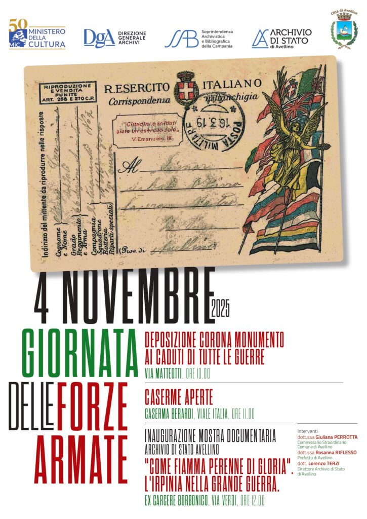 Il momento conclusivo delle celebrazioni è previsto alle ore 12:00, presso la sede dell’Archivio di Stato di Avellino, nell’ex carcere borbonico, dove sarà inaugurata la mostra documentaria “Come fiamma perenne di gloria. L’Irpinia nella Grande Guerra”.