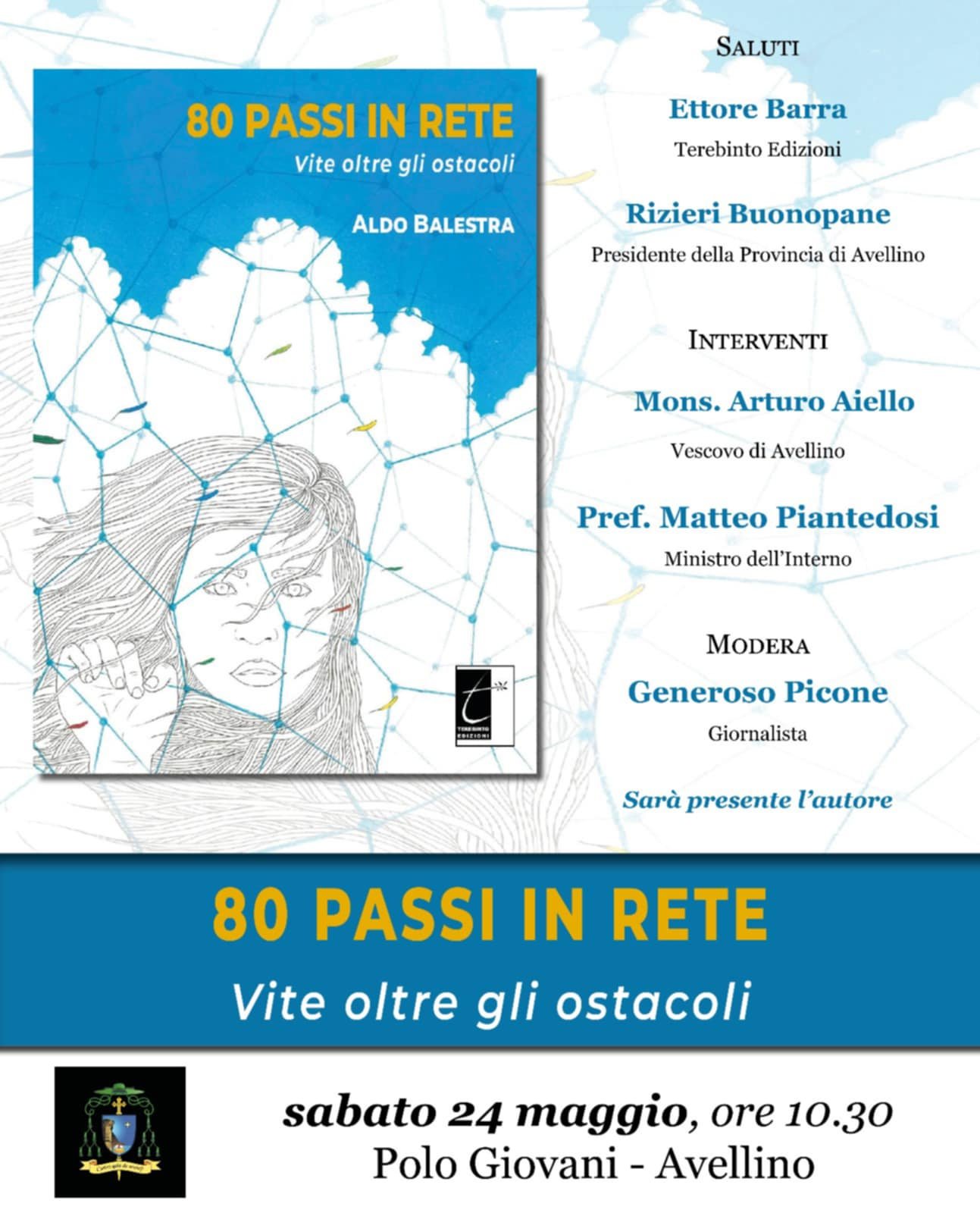 Dopo l’esordio al Salone del Libro di Torino, il viaggio tra le vite oltre gli ostacoli raccontate dal giornalista Aldo Balestra prosegue nel cuore dell’Irpinia. Appuntamento sabato 24 maggio, alle 10.30, al Polo Giovani. Porteranno i loro saluti Ettore Barra, Terebinto Edizioni – Rizieri Buonopane, Presidente della Provincia di Avellino. Interverranno Mons. Arturo Aiello, Vescovo di Avellino, il Ministro dell’Interno Matteo Piantedosi. Modera il giornalista Generoso Picone. “80 PASSI IN RETE. Vite oltre gli ostacoli” è un viaggio emozionante tra 80 storie vere che raccontano la forza della resistenza, il dolore delle sconfitte e la speranza di chi non si arrende. Nato dall’esperienza del blog “Diritto&Rovescio” su ilmattino.it, questo libro di Aldo Balestra trasforma la cronaca in narrazione umana, restituendo voce a chi spesso resta nell’ombra.