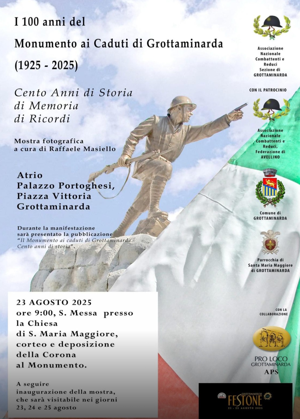 Grottminarda – Anche lui va per i cento. E, infatti, lo compie quest’anno. E li celebra proprio nei giorni del Festone, nel modo probabilmente più appropriato. Domani, sabato 23 agosto, a metà strada della festa più amata dai grottesi, si vivrà la memoria di quelli che sono stati i partecipanti alle due guerre mondiali. Perché si vuole ricordare il loro sacrificio ma anche che, questo mondo, oggi più che mai, ha bisogno di pace. Il Monumento ai Caduti della piccola piazzetta, come la chiama chi per generazioni li è cresciuto, e che un tempo è stato anche lo spazio per accanite partite a pallone tra bambini, rappresenta il ricordo, quindi, e viene celebrato attraverso una manifestazione piena di significati e di condivisione. Grottaminarda si prepara a vivere una giornata di profonda memoria e condivisione, in occasione del centenario del Monumento ai Caduti. Un simbolo che da un secolo custodisce il ricordo di chi ha sacrificato la propria vita per la patria, e che oggi viene celebrato con una manifestazione ricca di significato e partecipazione. Una mostra fotografica, raccolta in ben trecento fotostoriche, custodite dall’associazione Combattenti locale. Fulcro dell’evento sarà la mostra fotografica allestita per l’occasione, che raccoglie oltre 300 immagini storiche, provenienti dal nucleo più antico della collezione dell’associazione locale. Momenti che una immagine ha impresso nel tempo. Si tratta di momenti di vita, della storia della cittadina, e naturalmente delle persone che partivano o erano in guerra. Una seconda edizione di qusta mostra è in cantiere, prevista per il prossimo mese di novembre, possibilmente con nuove foto, altre ricerche e su quello che, questa comunità, è stata. Per non perdere il senso della vita stessa. Per una riflessione più profonda e collettiva. Con questa mostra si evidenzia come, per una comunità, è importante stringersi attorno a tutti i popoli che, ancora oggi, sono in guerra malgrado non lo vogliano. Per questo è necessario guardare oltre e dire”basta”alle guerre.