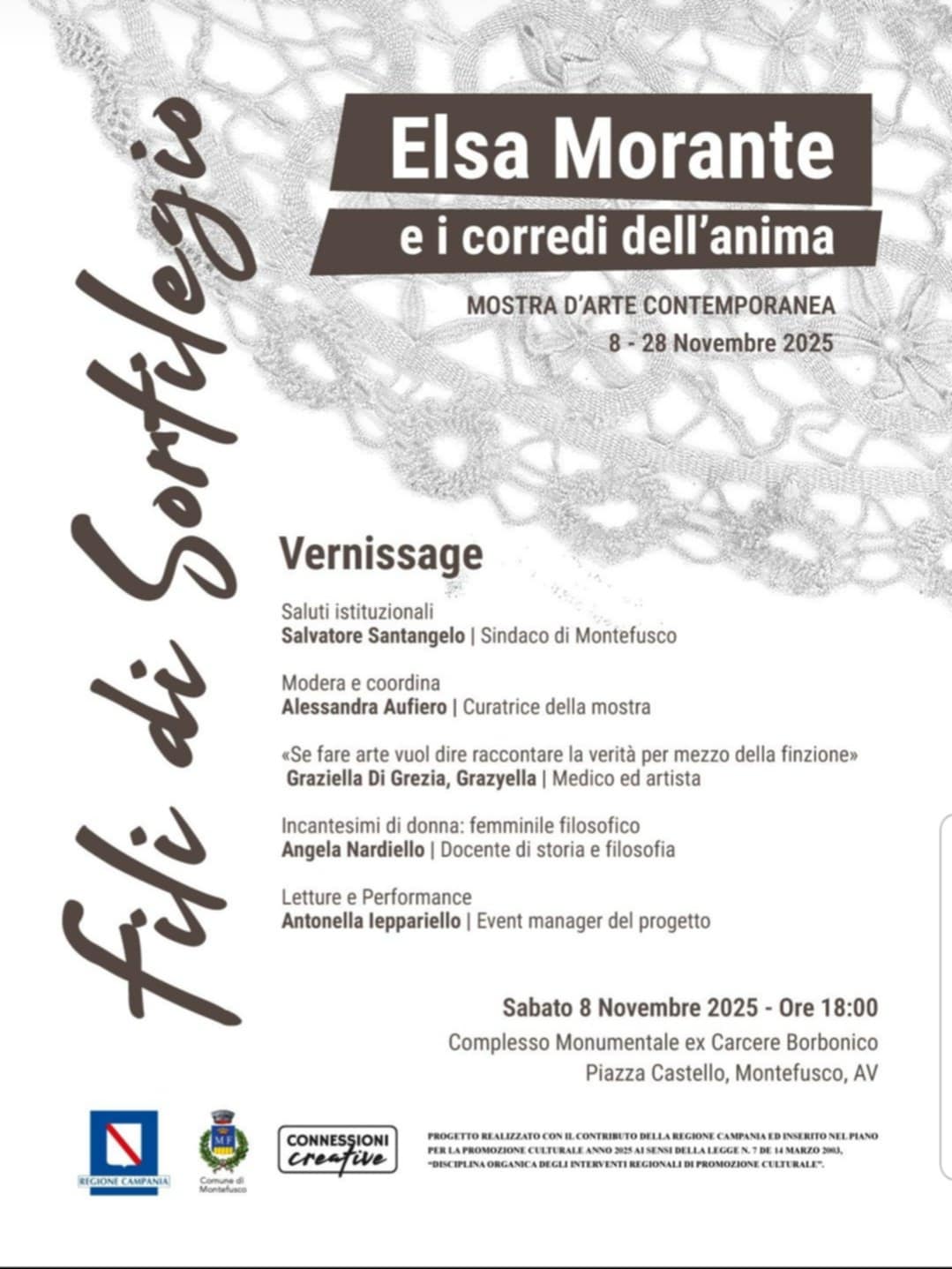 Protagonista l’associazione “Connessioni Creative”, promotrice della mostra “Fili di Sortilegio” liberamente ispirata all’universo simbolico e narrativo del romanzo morantiano “Menzogna e sortilegio”, allestita nelle sale del Museo del ricamo e del tombolo presso il Complesso Monumentale dell’Ex carcere Borbonico nel centro storico di Montefusco. L’antico museo si trasforma in un palcoscenico onirico: installazioni e opere site-specific diventano la traduzione visiva e immaginifica degli spazi interiori delle protagoniste del romanzo morantiano.