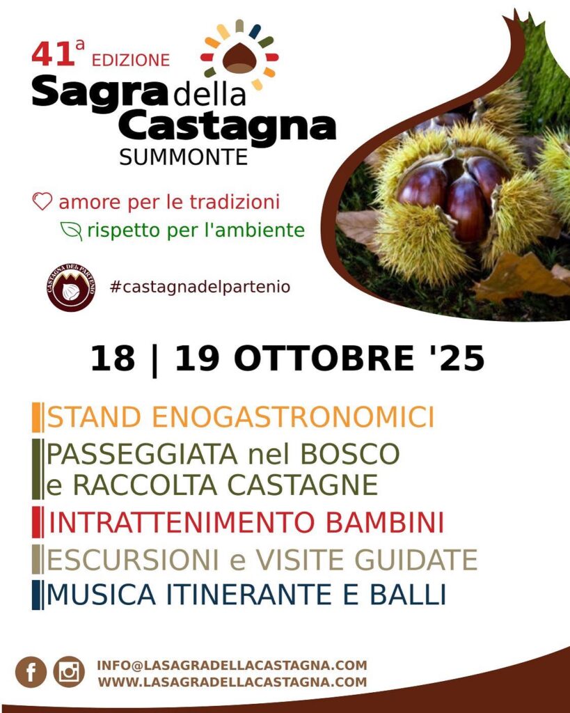 Dal gusto della castagna alla riscoperta del borgo. Sono gli ingredienti della 41ª edizione della Sagra della Castagna di Summonte, in programma sabato 18 e domenica 19 ottobre. Cuore dell’evento il centro storico del paese, ai piedi del Partenio. Un viaggio tra castagne, piatti tipici, artigianato locale, musica popolare, balli e giochi tradizionali, con l’obiettivo di valorizzare uno dei prodotti simbolo del territorio. Ad alternarsi stand gastronomici, spettacoli itineranti e momenti di convivialità aperti a tutte le età.