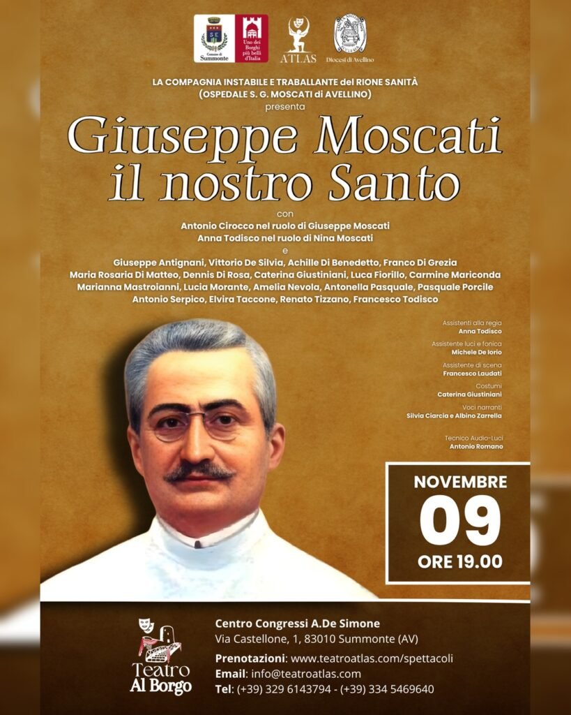 ” In un momento difficile per la comunità di Summonte, segnato dalla chiusura del Municipio e della Scuola a causa della loro dichiarata pericolosità — una ferita profonda per tutti noi — sentiamo ancora più forte il bisogno di ritrovarci e di stare insieme”. E’ il sindaco di Summonte Ivo Capone ad annunciare lo spettacolo dedicato a Giuseppe Moscati, racconto teatrale di Albino Zarrella liberamente ispirato all’idea di Anna Todisco e allo scritto di Paolo Bergamini, in programma il 9 novembre, alle 19, al centro congressi De Simone, portato in scena dalla compagnia Atlas, nell’ambito della rassegna “Summonte, il palcoscenico del Partenio”. “Accogliere e sostenere questa proposta culturale – spiega Capone – significa dare valore alla nostra comunità. riscoprendo la bellezza della condivisione e dell’aggregazione. La cultura è crescita e partecipazione, è forza collettiva”.