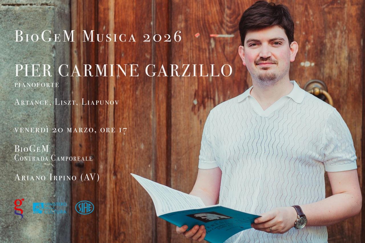 mensili da gennaio a giugno e da ottobre a dicembre compresi. Nomi di primissimo piano nel panorama musicale nazionale e internazionale si alterneranno nell’aula magna “Emmanuele F.M. Emanuele” di Biogem, ad Ariano Irpino. In programma, tra l’altro, una Master Class di Musica da Camera tenuta dal Maestro Nazzareno Carusi e dalla violoncellista Ludovica Rana nel mese di luglio, e lo spettacolo musicale “I giorni di Napoli” nella serata del giorno di apertura del Meeting Le Due Culture 2026, il 10 settembre, con la presenza del noto scrittore napoletano Maurizio de Giovanni. Prossimo appuntamento venerdì 20 marzo alle ore 17.00 per il concerto al pianoforte di Pier Carmine Garzillo. Giovane, ma già in possesso di una ricca esperienza nazionale e internazionale, è stato definito dalla stampa “una solida realtà della Scuola Pianistica Napoletana”. Il compianto, illustre musicologo e critico musicale Paolo Isotta, grande amico di Biogem, di lui ha scritto: “Pier Carmine possiede quell’affondo del tasto e quel cantabile che lo mostrano perfetto erede dell’insegnamento di Vincenzo Vitale”. A Biogem brani di F. Artance, F. Liszt e S. Lyapunov.