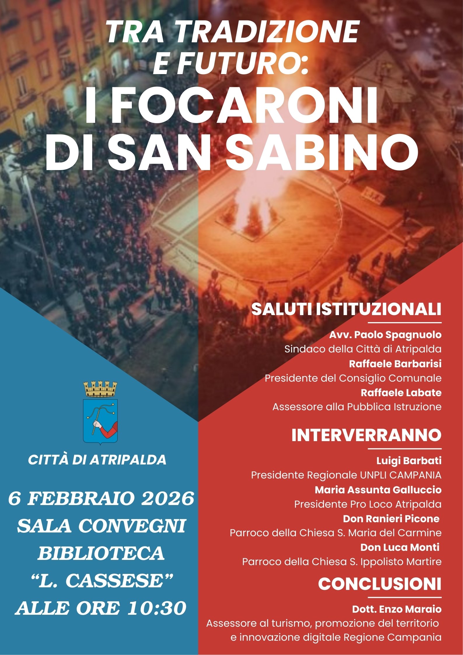 Un confronto dedicato a una delle tradizioni più sentite e identitarie della comunità atripaldese. E’ l’appuntamento dal titolo “Tra tradizione e futuro: i Focaroni di San Sabino”, in programma venerdì 6 febbraio 2026, alle ore 10:30, presso la Sala Convegni della Biblioteca Comunale “L. Cassese”. L’incontro si propone di valorizzare il significato storico, sociale e culturale dei Focaroni, guardando al contempo alle prospettive future: tutela delle tradizioni, coinvolgimento delle nuove generazioni, promozione del territorio e innovazione nella comunicazione e nell’accoglienza.
