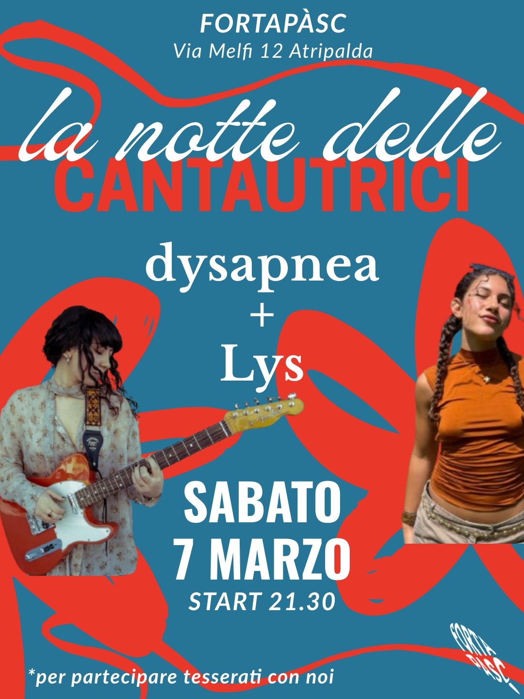 Sabato 7 marzo al circolo Arci Fortapasc di Atripalda (AV), in via Melfi, sarà di scena La Notte delle Cantautrici, concerto-evento con Lys (Giulia Pagano) e l’irpina dysapnea (Stella Urciuoli). Un modo diverso di celebrare la giornata delle donne, attraverso la musica di due giovani donne e cantautrici.