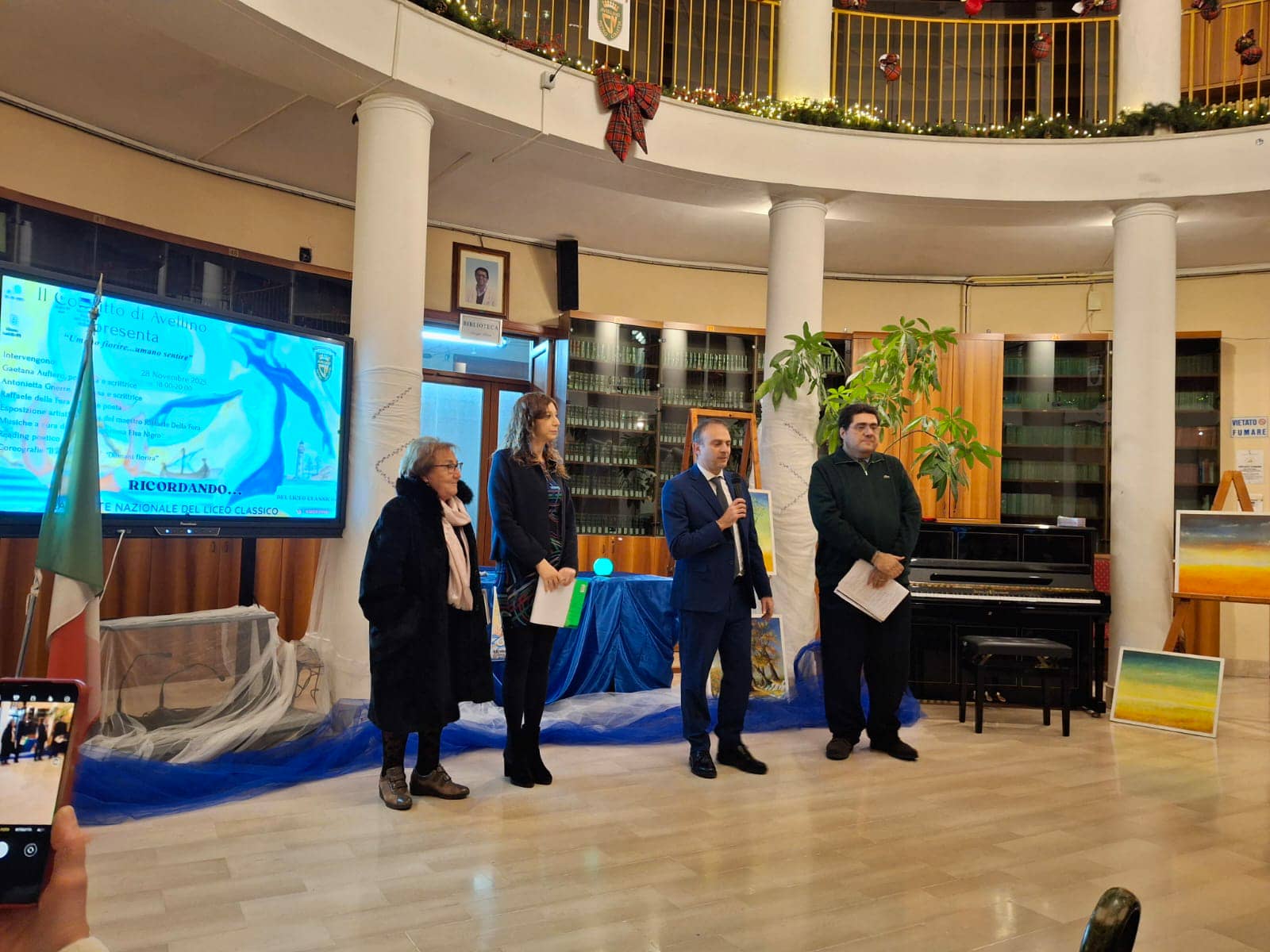 Aria di festa al Convitto Nazionale “Pietro Colletta” di Avellino, dove, alla vigilia del 194mo anno di fondazione dell’istituto, oggi diretto dal Rettore Dirigente Attilio Lieto, venerdi’ 28 novembre 2025 si e’ svolta una serata – evento per ribadire la convinta adesione della scuola irpina alla Notte Nazionale del Liceo classico. L’ evento e’ stato ideato 11 anni fa da Rocco Schembra, coordinatore del Comitato organizzativo, in cui, per i Convitti, opera da anni il Prof. Pellegrino Caruso che, insieme con la Prof.ssa Ilenia d’ Oria, ha curato un incontro ricco di suggestioni. In attesa della XII edizione della Notte che si svolgerà il 27 marzo 2026, sono state rievocate storie ispirate al tema del mare. Ci si e’ avvalsi della presenza della Prof.ssa Gaetana Aufiero, autrice della silloge poetica, ” Il mare non si ferna ai confini”, per riflettere su un elemento naturale che già i Greci vollero differenziare ora come pelagos, ora come pontos, ora come thalassa ad indicarne la molteplicità di situazioni ad esso legate. La Aufiero, da anni dedita a studi storici, nella sua silloge, presenta diversi quadri poetici da cui emergono le tante storie di emigrazione ed immigrazione che vedono le vicende umane legate ad un’ alternanza di destine, di cui l’ onda che abbassa e solleva e’ metafora per eccellenza. Nella Rotonda del prestigioso istituto trovano intanto giusta collocazione le opere del maestro Raffaele Della Fera che ritraggono altri elementi naturali, primi fra tutti alberi che ci ricordano il valore delle radici, che traggono nutrimento dal terreno e si fanno feconde forze vitali. All’ attenzione alla terra come casa comune da vivere e rispettare fa riferimento la poetessa Antonietta Gnerre che, facendo suoi gli insegnamenti di Papa Francesco, sulla scorta di Borges, ha raccolto le sue poesie nella silloge ” Umano fiorire”, che consente, dunque, di annunciare il tema della prossima edizione della Notte, che sarà proprio l’ humanitas. Ad impreziosire la serata ha contribuito l’ accompagnamento musicale del reading poetico di Elsa Maria Nigro. Diversi poi i momenti coreografici, curati dalla Prof.ssa D’ Oria, cosi’ come sono state reinterpretate, con accompagnamento al piano del Prof. Alfredo Spinelli, le storie di Guerriera Guerrieri e Maria Giuseppina Castellano Lanzara, tutrici della cultura nella Napoli del’ 43. Ancora una volta i giovani ragazzi del Convitto si sono impegnati nel difendere gli studi classici con quella forza allegra tanto cara a quel Francesco De Sanctis che amo’ il Convitto da soggiornarvi e studiarvi spesso e che ricordava che anniversari ed eventi servono per responsabilizzare, alla ricerca di sempre nuovi orizzonti di senso.E’ il motivo per cui, dopo un brindisi con un taglio di torta, realizzata dalle cuoche del Convitto Nazionale, i docenti tutti sono già proiettati verso le attività di orientamento ed il prossimo Open day del 13 dicembre in cui saranno allestiti tanti laboratori perché, come ribadisce il Rettore Lieto, a fine della serata, in cui e’ stato fondamentale il contributo di tutto il personale, “La scuola prende vita se si lavora ” insieme” e se si progetta tutto con passione, alla ricerca della speranza.”