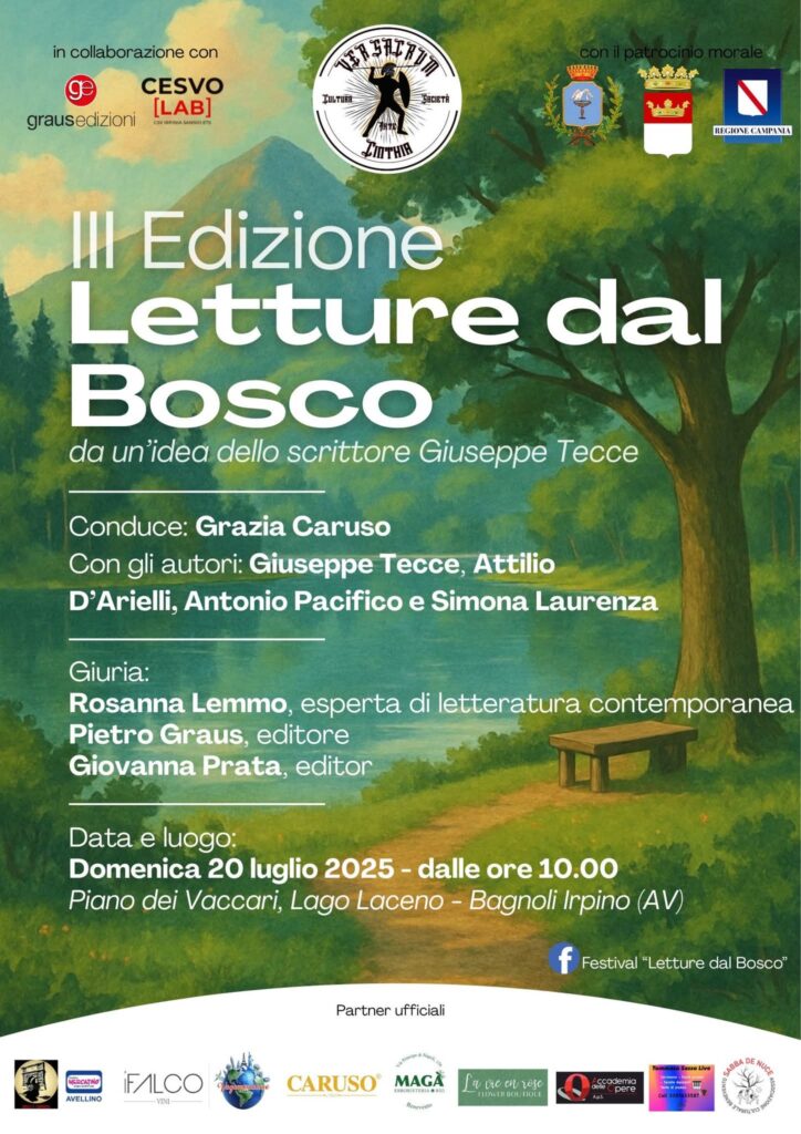 Lettura, natura e partecipazione tornano protagoniste con la terza edizione di Letture dal Bosco, il festival letterario ideato dallo scrittore Giuseppe Tecce e organizzato dall’associazione Ver Sacrum – Arte, Cultura e Società – Cinthia. L’appuntamento è per domenica 20 luglio 2025 nello splendido scenario del Piano dei Vaccari, al Lago Laceno e sarà condotto dalla presentatrice Grazia Caruso.
