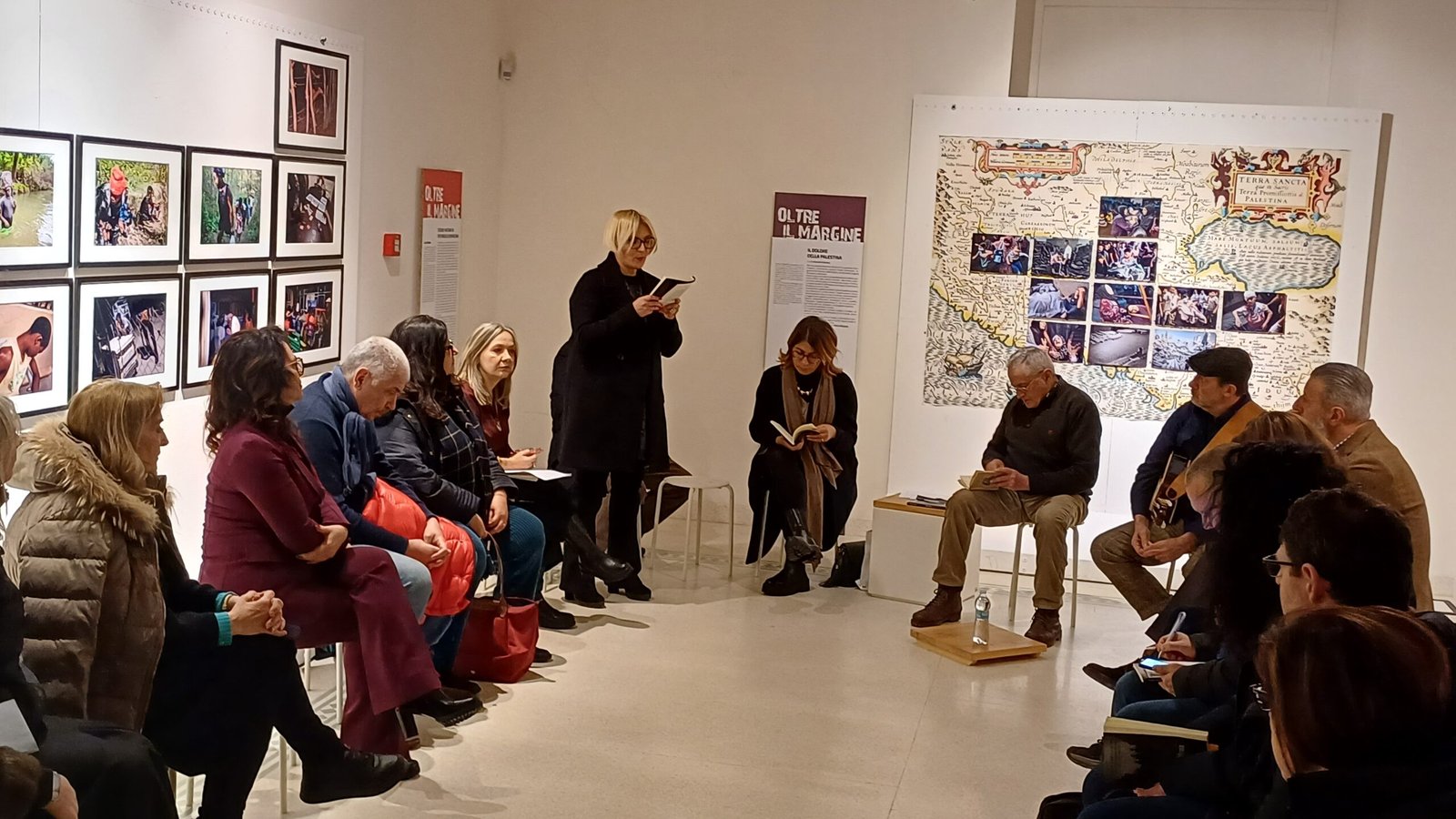 Un grido di dolore di fronte a un mondo che si riempie di macerie e massacri, tra città rase al suolo e bambini denutriti e sbandati. Nasce dalla volontà di non restare a guardare, di non smettere di far sentire la voce di chi soffre “Col cuore altrove”, reading nato all’interno della mostra fotografica collettiva “Oltre il margine”, tenutosi ieri al Museo Irpino. Un intreccio di poesie e riflessioni, raccolto in un prezioso volume, per denunciare l’ingiustizia e restituire memoria a chi non ha più la forza di parlare. Dal tentativo di ricostruire le origini della guerra in Palestina ai versi e riflessioni di Angelo Di Falco, Anna Coluccino Guerriero, Antonietta Gnerre, Antonio Iannaccone, Attilio Sordillo, Emanuela Sica, Franco Cafazzo, Ida Pugliese, Mario Penta, Massimo Vietri, Monia Gaita, Samuel Baldassarre, Valentina Mariani. Un reading accompagnato dalle parole del professore Angelo Di Falco, che ricorda come le ragioni del diritto internazionale continuino ad essere ignorate da Israele, che si sente al di sopra della legge, alle note del cantautore Massimo Vietri, che rende omaggio, attraverso le sue canzoni, a tutti i popoli della terra oppressi e dimenticati, dai curdi, ancora in cerca di una terra, ai tutsi perseguitati in Africa fino ai Nativi sterminati in America dai coloni europei. Un percorso che prosegue con le parole delle poetesse Cinzia Coppola ed Emanuela Sica, Alessandra Mariani e Maria Irpino, Mario Penta, Luciana Ambrosio, Ida Pugliese, Adriano Palmieri. Prezioso il contributo della psicologa Marianna Patricelli che si sofferma sul rapporto tra psicologia e leadership, ribadendo come “la leadership isrealiana è riuscita a far cadere gli ultimi baluardi di ragionevolezza attingendo ai mostruosi fantasmi dell’inconscio collettivo”. Mentre Anna Coluccino ci ricorda come “Il boicottaggio, il disinvestimento e la pressione per l’applicazione di sanzioni sono le uniche leve politiche che abbiamo e se le tantissime persone che hanno a cuore la causa palestinese le prendessero seriamente la nostra opinione peserebbe eccome”.