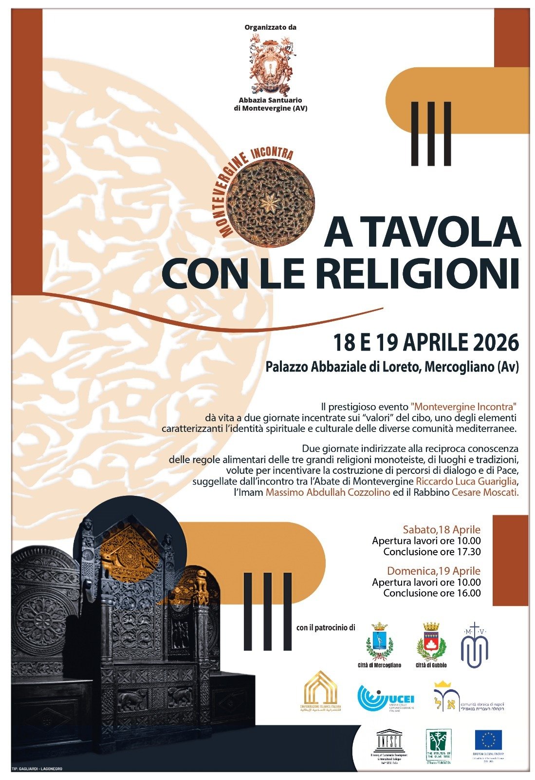 L’evento è organizzato con il Patrocinio di: Comune di Mercogliano, Comune di Gubbio, Biblioteca Statale di Montevergine, Comunità Ebraica di Napoli – UCEI, Confederazione Islamica Italiana e The Routes Of The Olive Tree – UNESCO