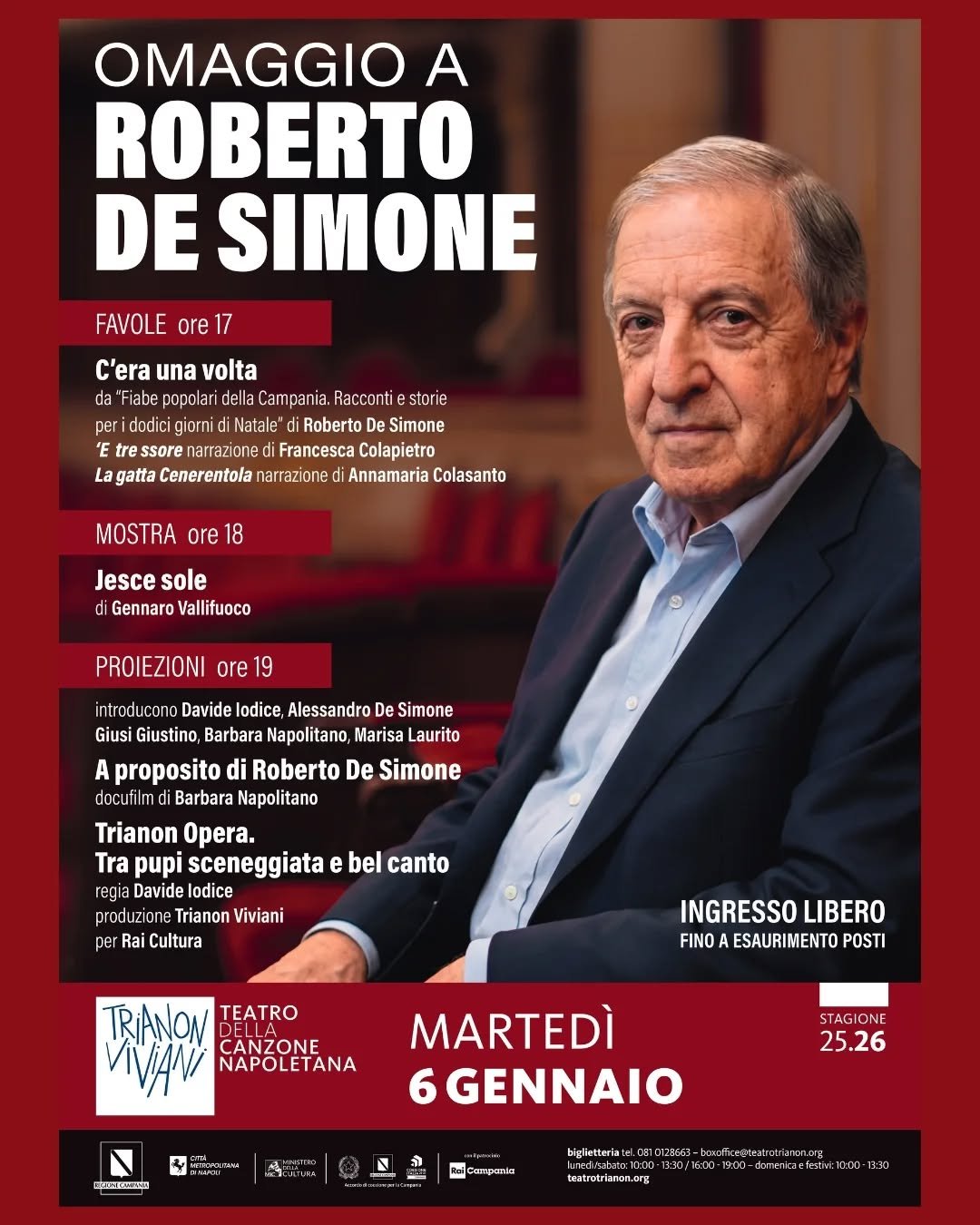 L’omaggio a Roberto De Simone del Teatro Trianon si aprirà il 6 gennaio con “C’era una volta, un dittico”, tratto dalle sue Fiabe popolari della Campania. Racconti e storie per i dodici giorni di Natale: ‘E tre ssore e La gatta Cenerentola, rispettivamente narrate da Francesca Colapietro e Annamaria Colasanto. Quindi, alle 18, l’inaugurazione della mostra iconografica Jesce sole… di Gennaro Vallifuoco, con illustrazioni e scenografie dell’opera di De Simone, e le testimonianze di Davide Iodice, Alessandro De Simone, Giusi Giustino, Marisa Laurito e Barbara Napolitano. L’Omaggio si concluderà con due proiezioni: A proposito di Roberto De Simone, docufilm di Barbara Napolitano, e Trianon Opera. L’ingresso è libero fino a esaurimento dei posti.