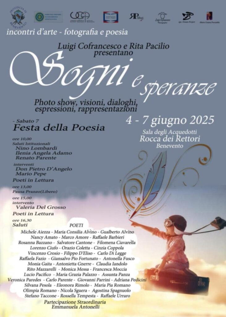 Nella suggestiva Sala degli acquedotti della Rocca dei Rettori, incorniciata dalle opere fotografiche di Luigi Cofrancesco, domani, 7 giugno dalle ore 10:00, si aprirà la nuova edizione della Festa della Poesia organizzata da Rita Pacilio. L’evento è inserito nella più ampia manifestazione Incontri d’Arte organizzati e curati da Luigi Cofrancesco e Rita Pacilio. Sarà la stessa Rita Pacilio, poetessa, scrittrice e performer, a fare gli onori di casa ai quaranta poeti provenienti da tutta Italia. Alla voce dei poeti si unirà la partecipazione straordinaria di Emmanuela Antonelli (Attrice). Dopo i saluti istituzionali riservati a Nino Lombardi (Presidente della Provincia di Benevento), a Ilenia Angela Adamo (Presidente U.C.A.I. sez. di Benevento e cantante) e a Renato Parente (Presidente del Consiglio Comunale) interverranno: don Pietro D’Angelo (Assistente ecclesiastico U.C.A.I. sez. di Benevento) e Mario Pepe (ex. Deputato). Nel corso della giornata poetica dedicata al tema “Sogni e Speranze” si susseguiranno letture, performance e dialoghi.