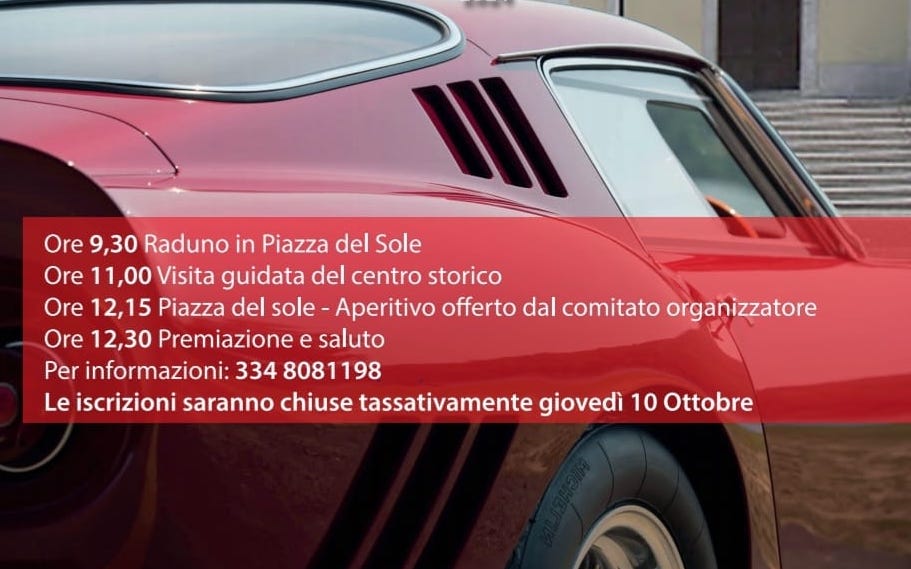 Il programma della giornata prevede il raduno delle auto alle ore 9,30 in piazza del Sole; alle ore 11,00 visita guidata al centro storico; alle ore 12,15 aperitivo offerto dal comitato organizzatore. La manifestazione si concluderà alle ore 12,30 con la consueta cerimonia di premiazione.