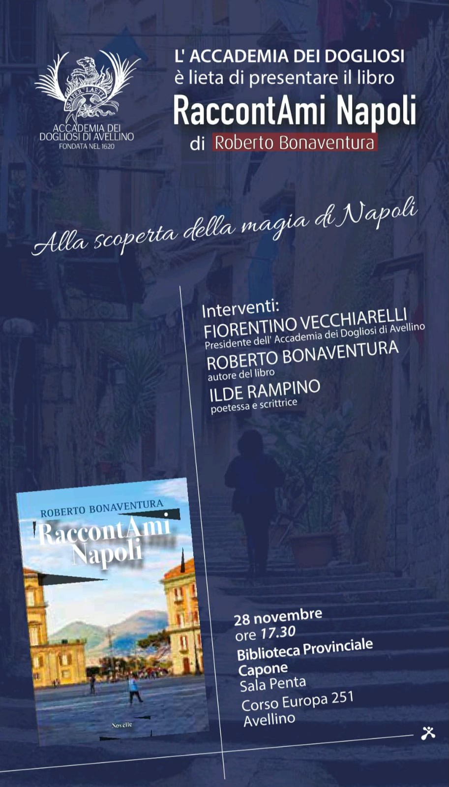Un viaggio appassionato tra le pieghe più nascoste e sorprendenti della città partenopea. E’ Il volume “RaccontAmi Napoli” di Roberto Bonaventura. Domani, alle 17.30, la presentazione alla Biblioteca Provinciale. . A confrontarsi con l’autore Fiorentino Vecchiarelli, presidente Accademia Dogliosi e la poetessa Ilde Rampino, Attraverso una raccolta di novelle intense e suggestive, il libro intreccia storie d’amore, dolore e rinascita, con aneddoti storici, curiosità rare e scorci di bellezza autentica. Napoli non è solo sfondo, ma protagonista viva: misteriosa, contraddittoria, luminosa. Una lettura che emoziona, informa e incanta, pensata per chi ama la città, ma anche per chi desidera scoprirla e riscoprirla nella sua verità più profonda.