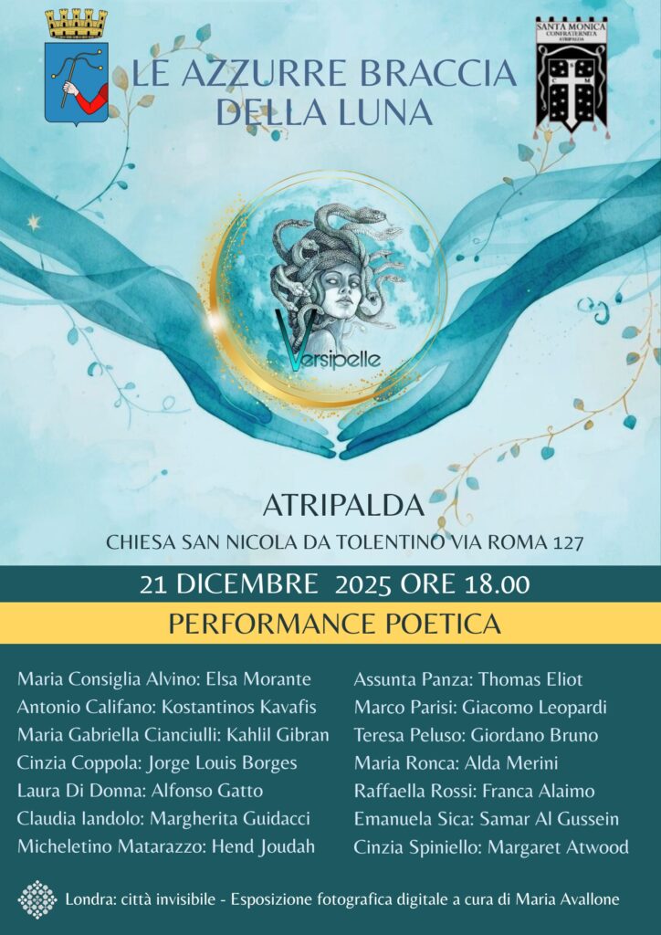 Il 21 dicembre alle ore 18:00, nella chiesa di San Nicola da Tolentino ad Atripalda, andrà in scena la performance poetica Le azzurre braccia della Luna, organizzata dalla comunità poetica Versipelle. Giunta alla sesta edizione, la manifestazione è dedicata alla memoria del poeta Armando Saveriano e nasce con l’intento di valorizzare e diffondere l’arte della poesia, mettendo in dialogo voci poetiche provenienti non solo dall’Irpinia, ma anche da altre province e regioni. Ciascun poeta proporrà la lettura di due testi: uno di propria composizione e uno di un altro autore. Ogni intervento sarà introdotto da una breve presentazione, pensata per offrire al pubblico ulteriori chiavi di lettura e riflessione. Quest’anno, inoltre, la performance sarà impreziosita dalla mostra fotografica digitale Londra: la città invisibile della fotografa atripaldese Maria Avallone.