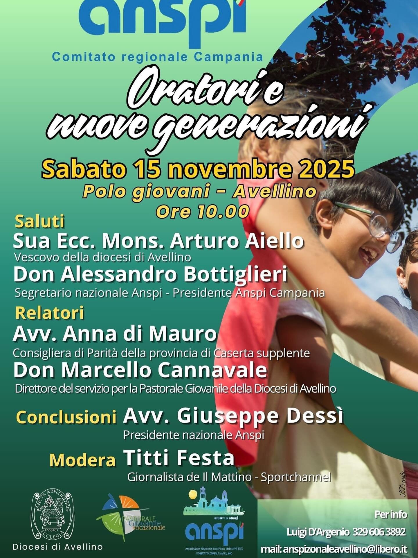Un incontro di riflessione e confronto sul ruolo educativo degli oratori nel cammino delle nuove generazioni. E’ l’appuntamento promosso dal Comitato Regionale Anspi Campania, in programma il 15 novembre, alle 10, al Polo Giovani. A portare i propri saluti Arturo Aiello, Vescovo della Diocesi di Avellino, don Alessandro Bottiglieri, Segretario nazionale ANSPI e Presidente ANSPI Campania. A relazionare Anna di Mauro, Consigliera di Parità della Provincia di Caserta supplente, don Marcello Cannavale, Direttore del Servizio per la Pastorale Giovanile della Diocesi di Avellino. Le conclusioni saranno affidate a Giuseppe Dessì, Presidente nazionale ANSPI. Modera Titti Festa, giornalista de Il Mattino e Sportchannel. Un’occasione di crescita, dialogo e impegno condiviso per la formazione delle nuove generazioni.