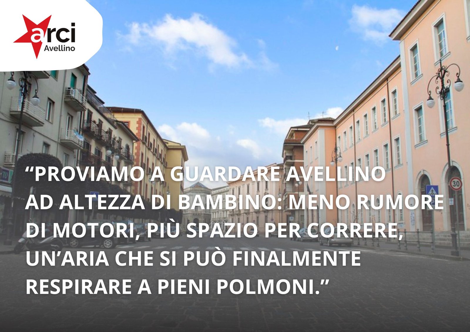 “Sospendere la circolazione e lo stazionamento dei veicoli significa anche abbattere i livelli di inquinanti proprio dove i bambini trascorrono la maggior parte della loro giornata, creando una bolla d’aria buona che segue i bambini e le bambine fin dentro le classi.” continua “Proviamo a guardare Avellino ad altezza di bambino: meno rumore di motori, più spazio per correre, un’aria che si può finalmente respirare a pieni polmoni. La città cambia dalle piccole cose, dal prendersi cura dei più fragili sospendendo per qualche ora i motori per attivare finalmente i piedi.”