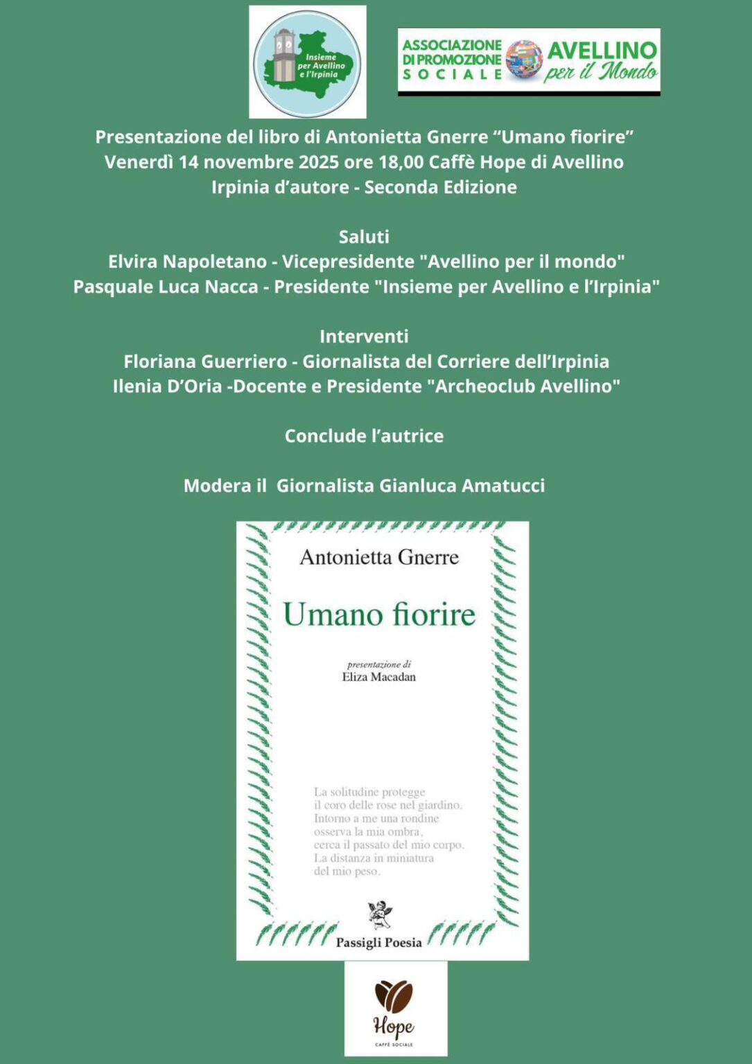 Ritorna alla sua seconda edizione la rassegna letteraria “Irpinia d’autore” dedicata a poeti e scrittori del territorio. Appuntamento domani pomeriggio al Bar Hope con la raccolta di Antonietta Gnerre Umano fiorire, Passigli edizioni. Interverranno Elvira Napoletano di Avellino per il mondo, Pasquale Luca Nacca di Insieme per l’Irpinia, Ilenia D’Oria dell’Archeoclub e la giornalista Floriana Guerriero. Modera Gianluca Amatucc. Punto di partenza della raccolta l’incanto della natura, la sua bellezza diventa occasione per riflettere sull’esistenza, per continuare a sperare in una rinascita possibile dell’uomo e della societa’, in un tempo in cui tutto è ridotto a mercato. “E’ una poesia…