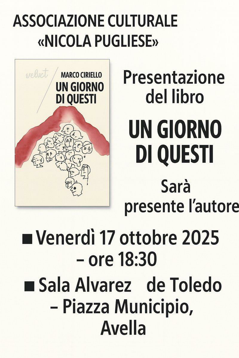 Prosegue l’impegno dell’associazione culturale dedicata alla memoria di Nicola Pugliese, scrittore partenopeo, autore del bellissimo Malacqua, che scelse di trascorrere ad Avella gli ultimi anni della sua vita. Un impegno nato dalla volontà di promuovere la letteratura come strumento di riflessione sul reale, a partire dal confronto sulle voci più interessanti dell’attuale panorama culturale. Il 17 ottobre, alle 18.30, presso la sala Alvarez in piazza Municipio, sarà presentato il romanzo di Marco Ciriello “Un giorno di questi”.