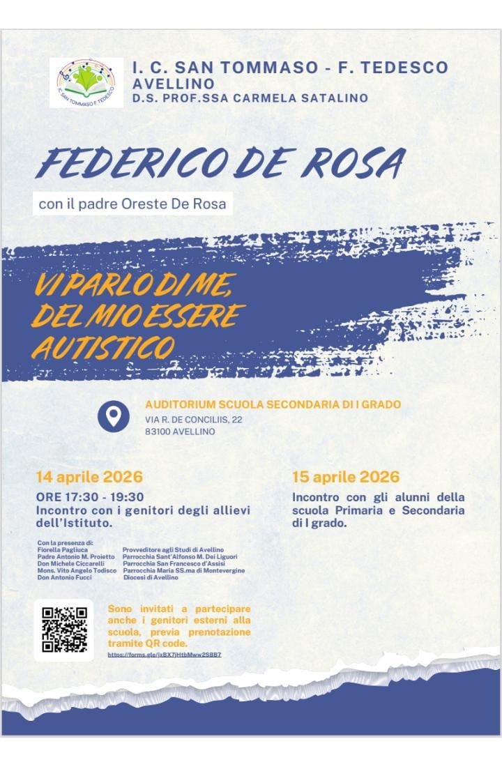 Iniziativa sull’autismo dell’Istituto Comprensivo di rione San Tommaso: due giorni di incontri e dibattiti nell’auditorium con i genitori e con gli studenti attorno alla testimonianza che sarà portata da Federico De Rosa e da suo padre Oreste. Il titolo dell’iniziativa (coordinata dalla dirigente scolastica professoressa Carmela Satalino) è “Vi parlo di me, del mio essere autistico”. Gli incontri si terranno il 14 e 15 aprile, nell’auditorium della scuola secondaria di primo grado dell’Istituto Comprensivo San Tommaso-Tedesco: il primo giorno l’appuntamento è dalle 17:30 alle 19:30, un incontro con i genitori degli allievi dell’Istituto alla presenza del provveditore agli studi di Avellino Fiorella Pagliuca, di padre Antonio Proietto (parroco della chiesa Sant’Alfonso Maria dei Liguori), don Michele Ciccarelli (parrocchia di San Francesco d’Assisi), monsignor Vito Angelo Todisco (parrocchia di Maria Ss.ma di Montevergine) e don Antonio Fucci della Diocesi di Avellino. Il giorno dopo, il 15 aprile, incontro con gli alunni della scuola primaria e secondaria di primo grado. “Sono invitati a partecipare – fanno sapere dall’Istituto San Tommaso-Tedesco – anche i genitori esterni alla scuola, previa prenotazione”.