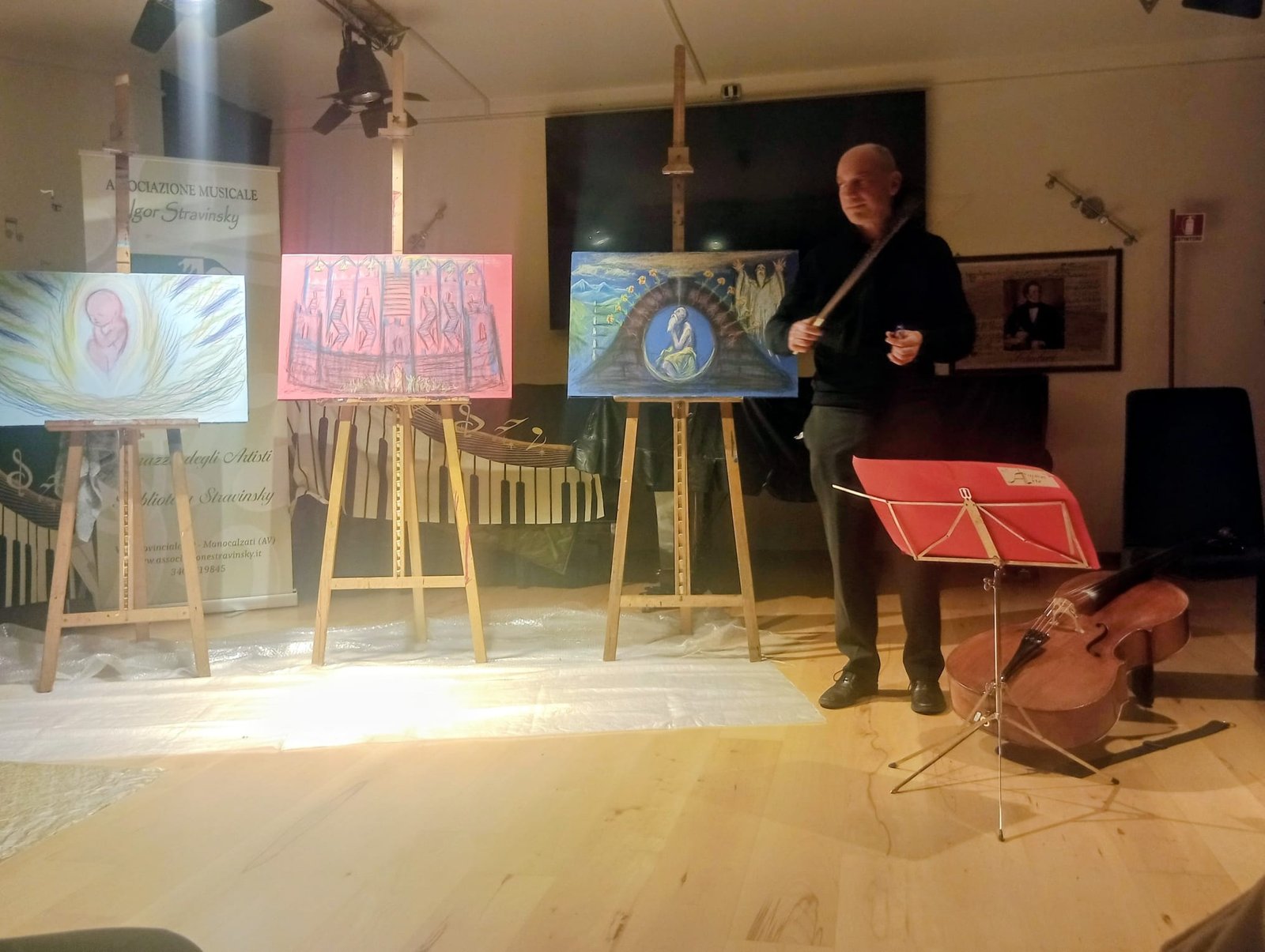 Sotto il titolo evocativo “Dipingendo e raccontando Bach – Tre quadri raccontano una storia”, per la Rassegna Innamorati della Musica 2026 – The per te…, con la direzione artistica dell’impareggiabile Maestro Nadia Testa, la serata ha preso forma come un affresco in divenire, dove i cromatismi sonori e visivi si sono intrecciati con naturalezza sorprendente. Protagonista musicale, il violoncellista Luca Provenzani ha restituito con intensità e rigore le Suites di Johann Sebastian Bach, affrontando un itinerario espressivo che ha attraversato la luce della Prima Suite in Sol maggiore, la solennità architettonica della Terza in Do maggiore e la tensione introspettiva della Quinta in Do minore.