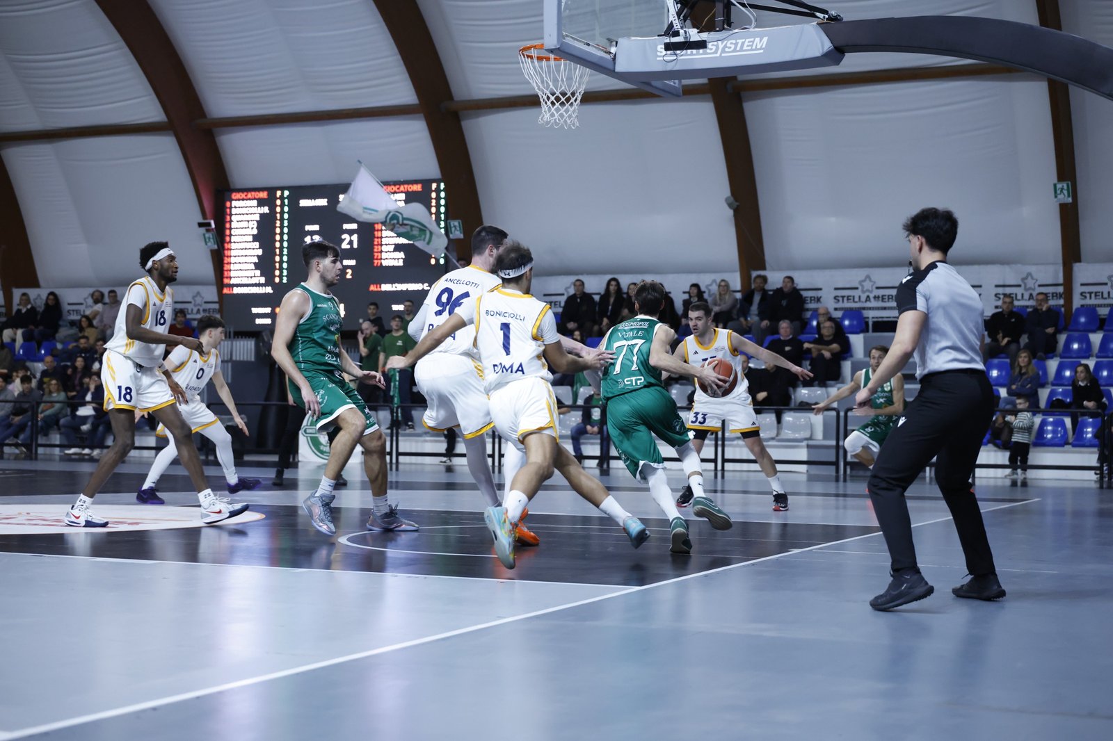 Determinante l’apporto offensivo del trio Stefanini–Gay–Kmetic, assoluti protagonisti della serata e autori dei canestri che hanno indirizzato definitivamente l’incontro in favore dei lupi. Con questo successo la Scandone centra il quinto successo consecutivo, sale a quota 28 punti in classifica e aggancia al secondo posto proprio la Stella EBK e Viterbo, che però hanno rispettivamente una e due partite in più rispetto ai biancoverdi. Pronti via parte meglio la Scandone Avellino che alza subito l’intensità difensiva e trova buone soluzioni offensive con Gay e Duranti. La Stella Roma costruisce con diversi extra pass ma è imprecisa al tiro. Gli irpini piazzano così un parziale di 8-0 con Gay e Duranti, sostenuti anche da alcune triple. Coach Boniciolli chiama time-out e la risposta dei capitolini arriva con Rubinetti e Fanti che riportano Roma a contatto. Nel finale Avellino si affida troppo al tiro da tre e perde qualche pallone, ma la tripla di Kmetic e un canestro da sotto di Stefanini ridanno slancio all’attacco biancoverde. Al 10’ la Scandone Avellino conduce 12-18.