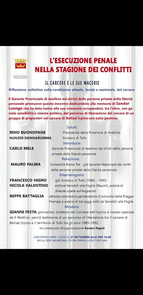 Seguiranno gli interventi di Francesco Nigro, già sindaco di Tufo negli anni 1980-1995, di Nicola Valentino, editore e autore di numerose opere dedicate all’ergastolo, e di Beppe Battaglia, attivista della Comunità delle Piagge di Firenze e autore di saggi sul mondo penitenziario. A moderare il dibattito sarà Gianni Festa, direttore del Corriere dell’Irpinia e inviato speciale de Il Mattino, che tra il 1985 e il 1992 ha seguito da vicino, anche attraverso un’esperienza diretta di due mesi in carcere, il percorso di liberazione dei detenuti di Bellizzi Irpino e il loro legame con il territorio di Tufo.