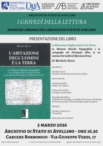 Giovedì 5 marzo prossimo, alle ore 16:30, nuovo appuntamento della rassegna libraria dell’Archivio di Stato di Avellino “I giovedì della lettura”. Nel corso dell’incontro si presenterà il libro “L’abitazione degli uomini è la terra. Le Memorie Storiche Topografiche e la…