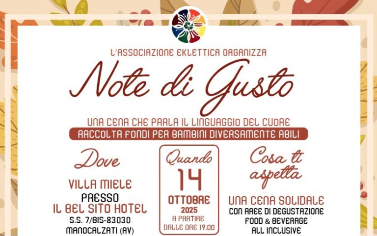 “Note di Gusto: Una Cena Che Parla Il Linguaggio del Cuore”. Una serata, promossa dall’Associazione Eklettica, guidata da Rosa Rota Sirignano, nel segno della solidarietà in programma il 14 ottobre presso Villa Miele, una suggestiva ed accogliente location, parte integrante dell’ Hotel Bel Sito, all’uscita autostradale di Avellino Est. Ad accogliere la kermesse sarà il giardino con piscina che circonda…
