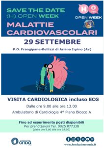 In occasione della Giornata mondiale del Cuore il 29 settembre l’Asl Avellino insieme a Fondazione Onda ETS ripropone l’(H) Open Week dedicato alle malattie cardiovascolari, in programma presso il P.O. “Frangipane-Bellizzi” di Ariano Irpino dalle ore 9.00 alle ore 13.00.…