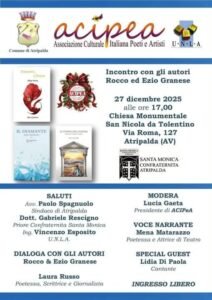 Sabato 27 dicembre, nella Chiesa di San Nicola da Tolentino, in Via Roma 127 ad Atripalda, l’A.C.I.P.e A. (Associazione Culturale Italiana Poeti e Artisti) promuove un confronto dedicato ai volumi di Rocco ed Ezio Granese. Da “Emozioni d’amore” di Rocco…
