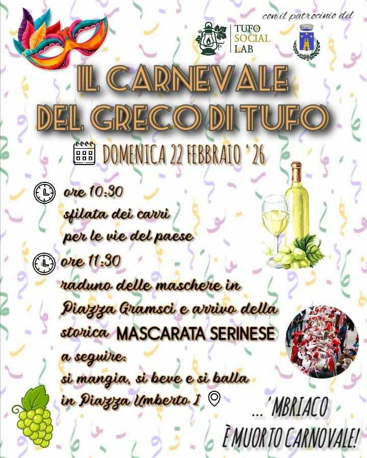 Domenica 22 febbraio il borgo di Tufo si prepara ad accogliere “Il Carnevale del Greco di Tufo”, promosso da Tufo Social Lab con il patrocinio del Comune di Tufo. Un evento che unisce la vivacità del Carnevale alla grande tradizione vitivinicola del territorio, celebrando il celebre Greco di Tufo DOCG in una giornata all’insegna della cultura, dell’enogastronomia e del divertimento…