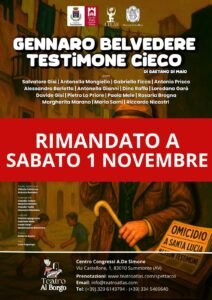 Il Comune di Summonte informa che per precauzione, a causa dello sciame sismico in corso, lo spettacolo “Gennaro Belvedere, testimone cieco” previsto per oggi a Summonte, presso il Centro Congressi A. De Simone, è rimandato a SABATO 1 NOVEMBRE ore…