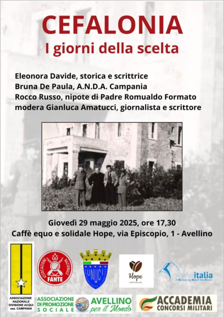 Si intitola “Cefalonia, i giorni della scelta” il convegno in programma ad Avellino giovedi 29 maggio a partire dalle 17:30 presso il caffè equo e solidale Hope di Via Episcopio 1, ad Avellino. Il confronto sarà l’occasione per affrontare il discorso legato alle testimonianze di quel tragico settembre del 1943 e agli scritti di Padre Romualdo Formato. Il convegno è stato organizzato dal giornalista e scrittore Gianluca Amatucci con il supporto dell’APS Avellino per il Mondo. Saluti: – Elvira Napoletano, Vicepresidente Aps Avellino per il Mondo; – Antonio Argenio, Presidente UNUCI Avellino, Interventi di: – Rocco Russo, nipote di Padre Romualdo Formato; – Bruna De Paula, ANDA (Associazione Nazionale Divisione Acqui) sez. Campania – Eleonora Davide, storica e scrittrice. A moderare e coordinare gli interventi, Gianluca Amatucci. Tra i partecipanti: ANDA, UNUCI, Associazione Nazionale del Fante sezione di Avellino.