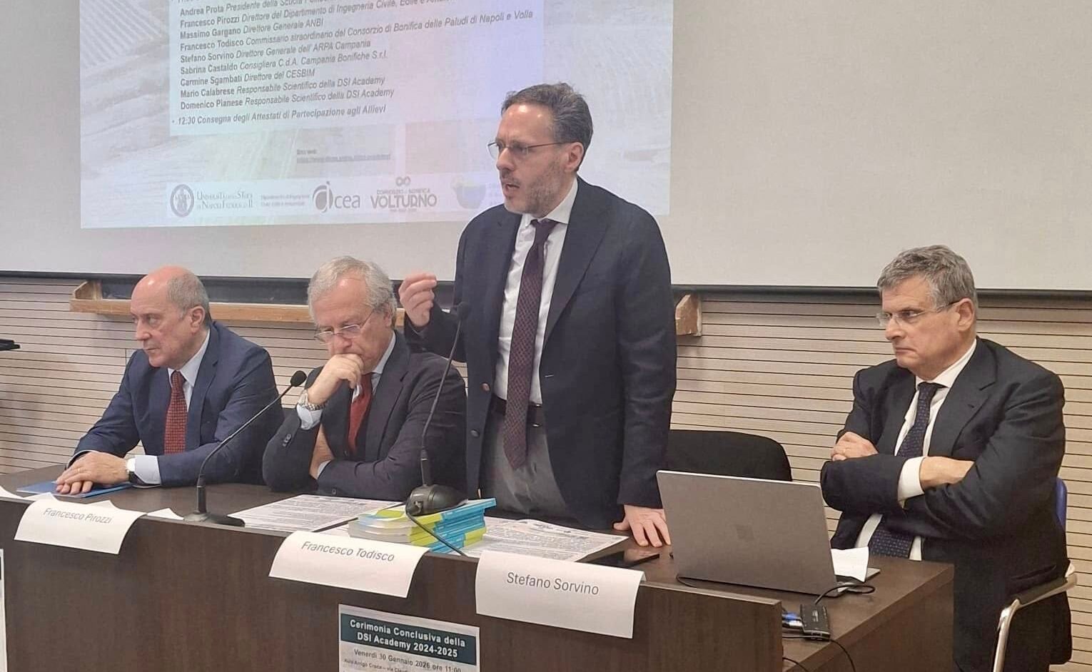 “Un grande plauso ai ragazzi che hanno conseguito il diploma della DSI Academy. Con la cerimonia di consegna dei diplomi, che si è tenuta stamane, si è conclusa la prima edizione della ‘Drainage and Sustainable Irrigation Academy’, iniziativa voluta dal Consorzio Generale di Bonifica del Bacino Inferiore del Volturno, dal Consorzio di Bonifica delle Paludi di Napoli e Volla e dal Dipartimento di Ingegneria Civile, Edile e Ambientale della Università degli studi di Napoli Federico II. Abbiamo voluto con testardaggine questo percorso che ha portato alla formazione e alla costruzione di pezzi di classe dirigente del futuro che si occuperanno di temi complessi e di grande rilevanza per il destino dell’umanità”. Così Francesco Todisco, presidente del Consorzio di Bonifica.