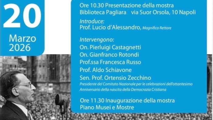 In occasione dell’80° anniversario della nascita della Democrazia Cristiana, il Comitato Nazionale per le Celebrazioni promuove a Napoli la mostra fotografica “DC. Storia di un Paese”, in programma dal 20 marzo al 24 aprile 2026 presso l’Università degli Studi Suor Orsola Benincasa.