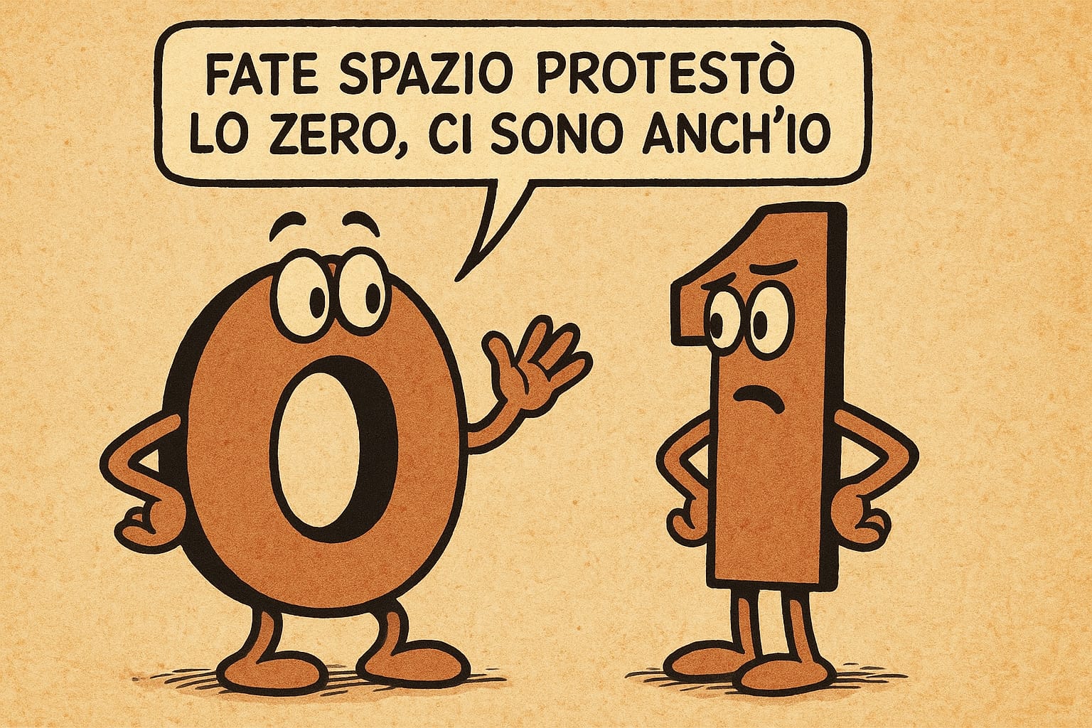 Concludo questa mia narrazione con il riferimento al sistema di numerazione binario; questo è il fondamento dell’informatica e della tecnologia digitale, cioè del linguaggio dei computer ed è costruito con due sole cifre: lo zero e l’unità che prendono il nome di bit (binary digit); queste cifre corrispondono, nei circuiti elettrici a cui sono collegate, ad acceso (1) l’informazione passa e spento (0) l’informazione non passa (perché non c’è); è un sistema posizionale, come quello decimale, che utilizza lo spostamento a sinistra ogni volta che risulta esaurita la disponibilità di cifre nella colonna impegnata; ogni spostamento assume il valore della potenza di due corrispondente al peso dello spostamento; quindi, ad es. mentre Il numero 0 si scrive senza problemi e lo stesso il numero 1 la prima difficoltà si pone in relazione al numero 2 : essendo esaurite le cifre disponibili nella colonna di partenza, si scrive 10 (che si legge uno zero) dove 0 conta le unità e 1 conta le coppie. Utilizzando questo criterio i numeri del sistema decimale 0 – 1 – 2 – 3 – ecc. si rappresentano in codice binario rispettivamente 0 – 1 – 10 (uno zero) – 11 (uno uno) – ecc. .