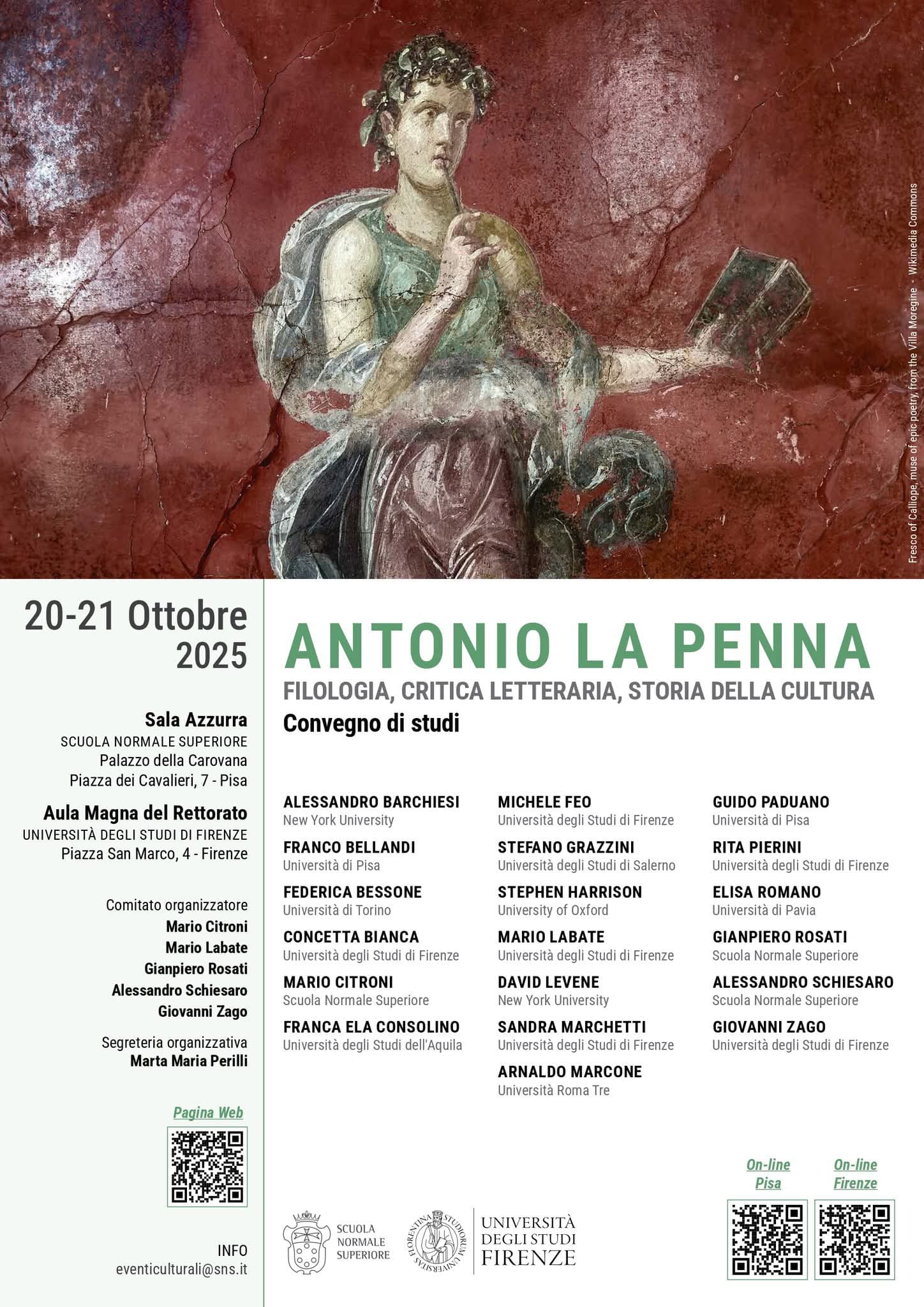 Il convegno intitolato “Antonio La Penna. Filologia, critica letteraria, storia della cultura”, che si terrà il 20 e il 21 ottobre 2025 tra Pisa e Firenze, si propone come tappa significativa nella riflessione critica sull’intera opera di un gigante della classicistica italiana. L’occasione assume una duplice importanza: da una parte il tributo a un maestro che ha lasciato un’impronta profondissima nella filologia latina e nella cultura accademica italiana; dall’altra, la presentazione di un bilancio critico complessivo che attraversa generazioni di allievi, scuole, e patrocini intellettuali.