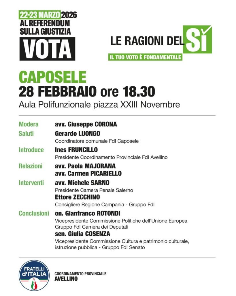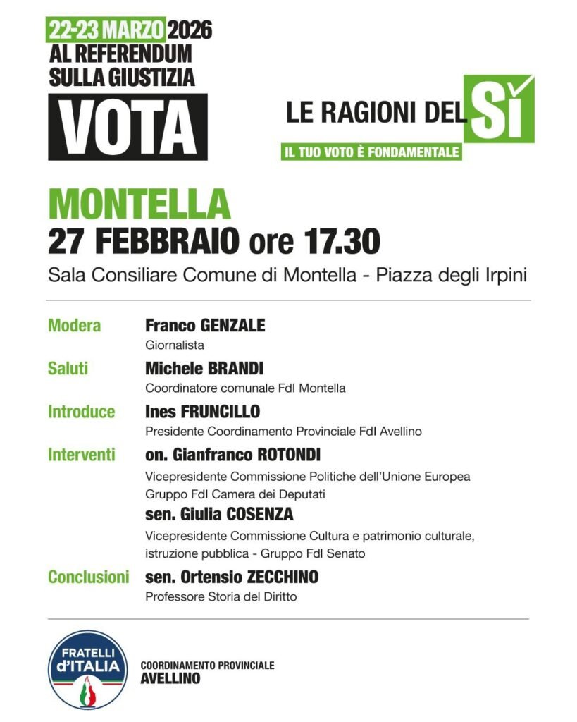 Il Coordinamento Provinciale di Fratelli d’Italia Avellino inaugura la campagna referendaria in vista del voto del 22 e 23 marzo 2026 sulla riforma della giustizia, avviando un ciclo di iniziative pubbliche che rappresentano i primi appuntamenti di un percorso destinato a toccare, in modo organico e strutturato, tutte le macroaree della provincia di Avellino. Un’azione politica consapevole e radicata nei territori, fondata sull’approfondimento dei contenuti, sull’ascolto delle comunità e su un confronto serio e documentato.