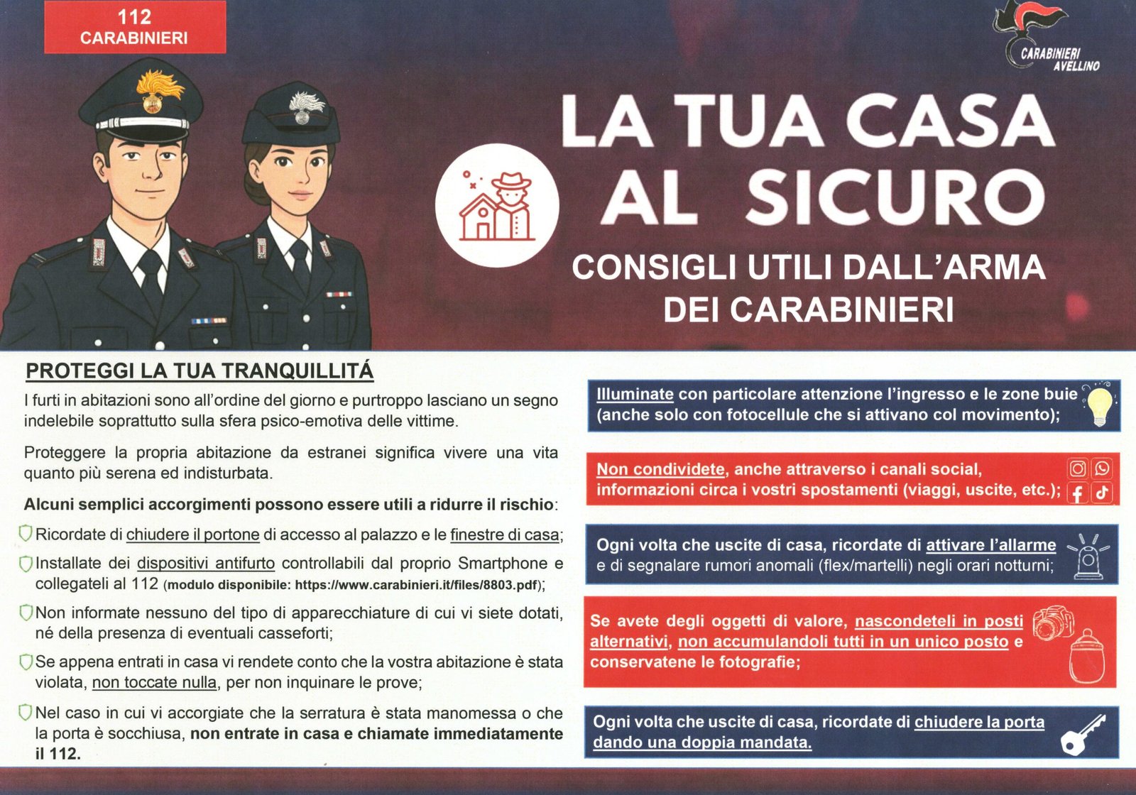 Nonostante l’incessante impegno delle Forze dell’Ordine, il fatto che i responsabili non vengano sempre assicurati alla giustizia nell’immediato genera un persistente senso di insicurezza. Per questo motivo, è fondamentale il coinvolgimento attivo dei cittadini. A tale scopo, sono stati realizzati due opuscoli informativi che suggeriscono i piccoli accorgimenti quotidiani utili da mettere in pratica da un lato per proteggere meglio le proprie abitazioni senza stravolgere le proprie abitudini, dall’altro scoraggiare chiunque nel perpetrale tali azioni criminali. Questi consigli nascono da uno studio nazionale, appositamente attagliato ai casi specifici avvenuti sul territorio irpino dal settembre dello scorso anno sino ad oggi.