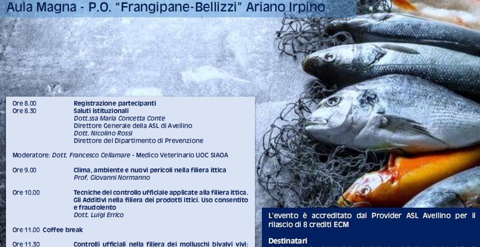 Il sistema dei controlli in materia di igiene e sicurezza alimenti nella filiera ittica è al centro dell’evento formativo promosso dal Dipartimento di prevenzione dell’Asl di Avellino. Il corso dal titolo “Filiera Ittica – Stato dell’arte dei controlli ufficiali e altre attività ufficiali specifiche di settore” si terrà venerdì 5 settembre nell’Aula Magna del P.O. “Frangipane-Bellizzi” di Ariano Irpino e vedrà la partecipazione di esperti del settore impegnati a vario titolo nella filiera dei prodotti ittici, dall’allevamento fino alla vendita e consumo, a garanzia della sicurezza alimentare.