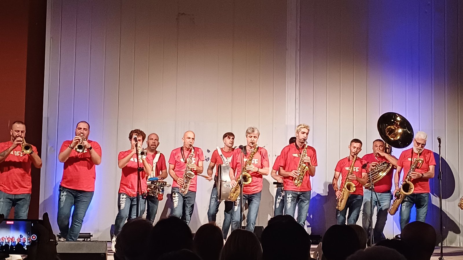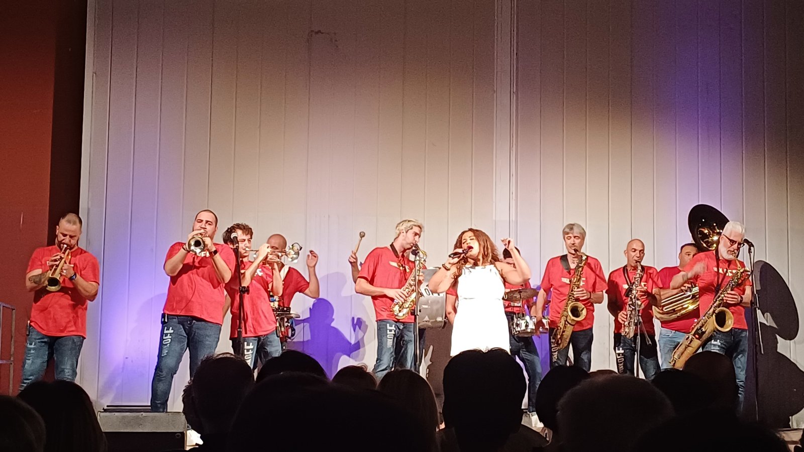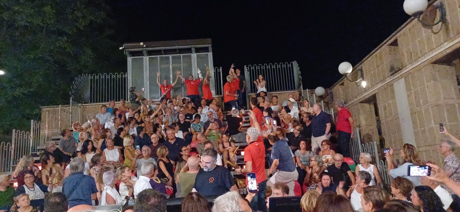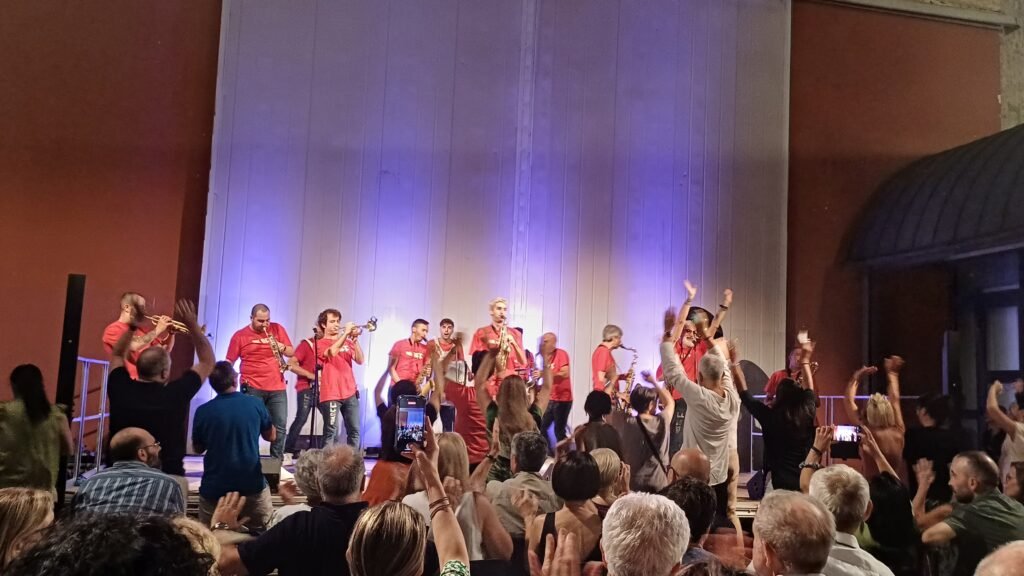 Ad accompagnarlo una band capace di virtuosismi ma anche di non prendersi troppo sul serio, musicisti bravissimi e affiatati come pochi, che trasmettono energia pura ma che sanno tenere il palco, superando i limiti legati all’esibizione in una postazione fissa, accompagnati dalla voce calda e bellissima di Nadyne Rush. A colpire la varietà degli strumenti dal sax alla tromba, dalla batteria alla gran cassa, capaci di fondersi in maniera perfetta, senza che nessuno si sovrapponga agli altri, tra note funky, jazz, soul fino ad abbracciare ritmi pop. Una scommessa nata quadi 30 anni fa, quella dei Funk Off, che si esibiranno anche in Giappone, capaci di mescolare influenze molteplici nei loro brani frizzanti e carichi di ironia, a partire dai titoli, come nel divertentissimo “Shangai talks” in cui le note evocano le sonorità del Giappone, accompagnate, come precisa Cecchini, dal movimento della mano degli spettatori che richiama quello dei gatti e si fa auspicio di guadagno. Fino alle note più malinconiche “E’ come quando ti chiedono come stai in inglese e rispondi ‘it’s ok’ con un filo di voce”. Alla fine sono gli stessi musicisti a chiedere al pubblico di venire a ballare sotto il palco, Dario scherza sui freni inibitori del pubblico “Sappiamo che tutti muoiono dalla voglia di farlo ma pochi hanno il coraggio. Dovete lavorare sui vostri freni inibitori”. Per loro una standing ovation e la certezza che si potrebbe stare ad ascoltarli per ore. Una serata che conferma la capacità della musica di unire, abbattere barriere, regalando una serata speciale a una città che appare ancora smarrita ma che sa ritrovarsi quando si confronta con energia e bellezza. Sul palco, insieme a Dario Cecchini, band leader, sax baritono – Giuliano Teofrasto, tromba – Nicola Cellai, tromba – Emiliano Bassi, tromba – Sergio Santelli, sax alto – Tiziano Panchetti, sax alto – Andrea Pasi, sax tenore – Claudio Giovagnoli, sax tenore – Giacomo Bassi, sax baritono – Nicola Cipriani, sax baritono – Saverio D’Errico, sousaphone – Francesco Bassi, rullante, rhythm section coordinator – Alessandro Suggelli, grancassa – Luca Bassani, piatti – Daniele Bassi, percussioni – Special Guest: Nadyne Rush, voce
