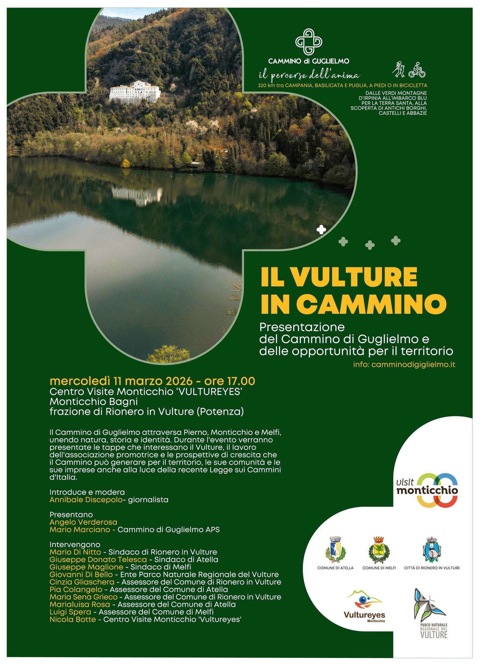 “Il Cammino di Guglielmo” abbraccia l’area del Vulture. Il percorso, articolato in 15 tappe tra Campania, Basilicata e Puglia, vede nell’area del Vulture il baricentro relazionale e geografico dei 320 km di lunghezza dell’intero percorso. In particolare, il tracciato entra in Basilicata a Pescopagano e vede la prima sosta a Rapone, quindi San Fele-Pierno con la splendida badia legata al santo Guglielmo, quindi Atella, Monticchio e poi Melfi, Venosa e Montemilone. Il tracciato unisce paesaggio naturale, storia medievale e spiritualità in un itinerario che si sta affermando come nuova esperienza di turismo lento nel Mezzogiorno. Se ne parlerà nwl corso di un incontro in programma l’11 marzo al Centro Visite Monticchio di Monticchio Bagni. Durante l’incontro verranno illustrate le tappe del percorso, il lavoro dell’associazione promotrice e le prospettive di sviluppo legate anche alla recente legge nazionale dedicata ai Cammini d’Italia.