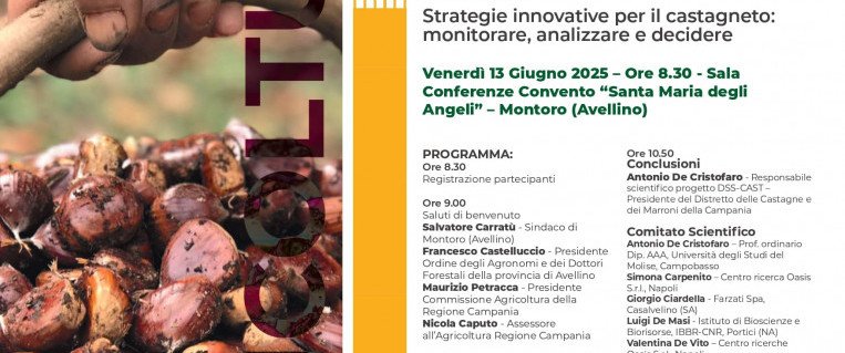 Sarà una giornata chiave per il futuro del castagneto in Campania quella di venerdì 13 giugno, quando il progetto DSSCAST presenterà al pubblico risultati, tecnologie e strategie per l’innovazione del settore. L’evento si svolgerà a Montoro, presso la Sala Conferenze del Convento “Santa Maria degli Angeli”, con inizio alle ore 8.30, e vedrà la partecipazione di istituzioni, esperti scientifici, aziende agricole e attori del mondo della ricerca. Finanziato dal PSR Campania 2014/2020 – Misura 16.1.2, DSSCAST promuove l’adozione di Sistemi di Supporto Decisionale per migliorare il management dei castagneti e favorire pratiche sostenibili ed efficienti.