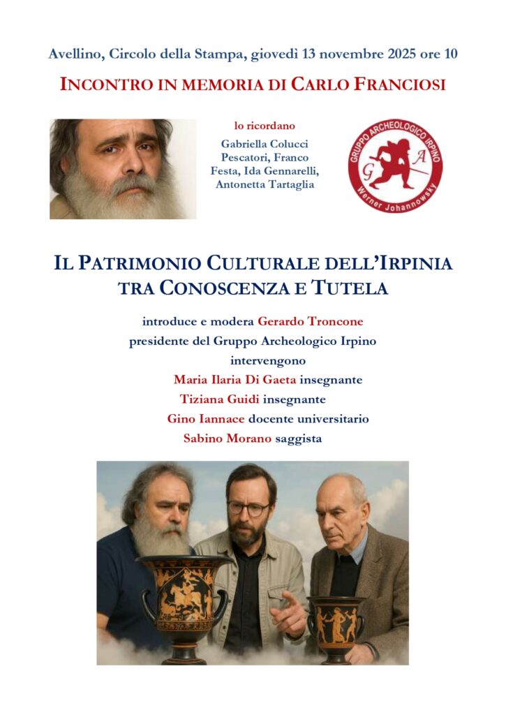 Chiama alla riflessione sul patrimonio culturale dell’Irpinia tra conoscenza e tutela il gruppo archeologico Johannowsky. Un incontro, in programma il 13 novembre alle 10, al Circolo della stampa, che vuole essere l’occasione per ricordare l’archeologo Carlo Franciosi, punto di riferimento della ricerca archeologica irpina, scomparsa nei giorni scorsi all’età di 80 anni. Decisivo il suo contributo negli scavi di Carife e della Caudina, di Bisaccia ed Aeclanum, un contributo dettato da una passione autentica per il territorio, A ricordarlo Gabriella Pescatori, Franco Festa, Antonetta Tartaglia. Intervengono le docenti Maria Ilaria Di Gaeta e Tiziana Guidi, Gino Iannace, docente universitario e Sabino Morano, saggista. Modera Gerardo Troncone, presidente del Gruppo Archeologico Irpino-