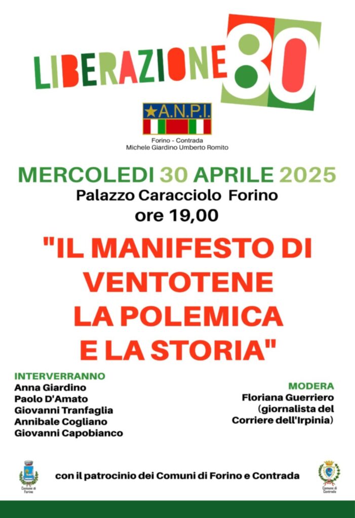 Una riflessione sul Manifesto di Ventotene tra polemica e storia. E’ l’incontro in programma il 30 aprile, alle 19, a Forino, a cura della sezione Anpi Forino e Contrada “Michele Giardino-Umberto Romito” con il patrocinio dei Comuni di Forino e Contrada. A confrontarsi lo storico Giovanni Tranfaglia, il ricercatore Paolo D’Amato, Anna Giardino dell’Anpi di Forino, lo storico Annibale Cogliano, Giovanni Capobianco, presidente provinciale Anpi. Modererà il dibattito Floriana Guerriero.