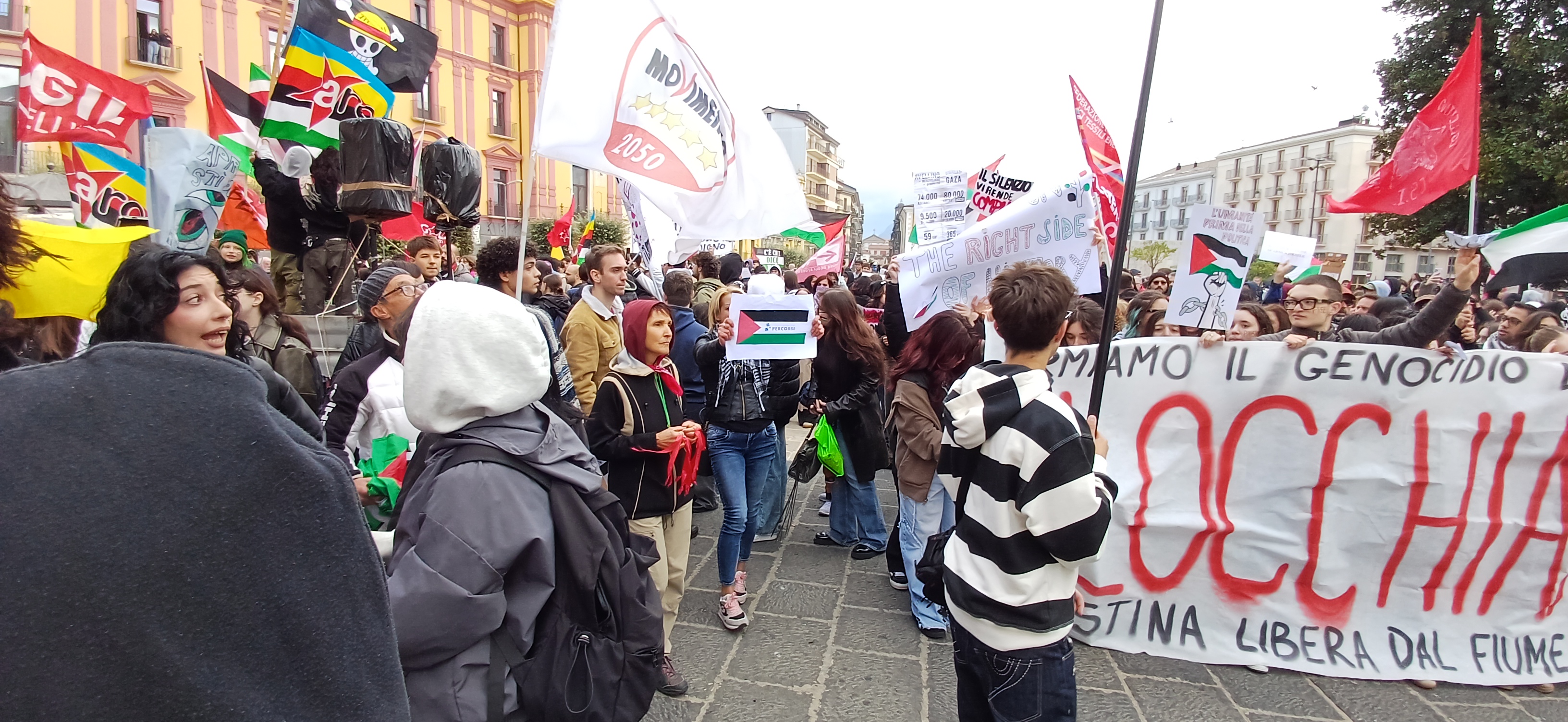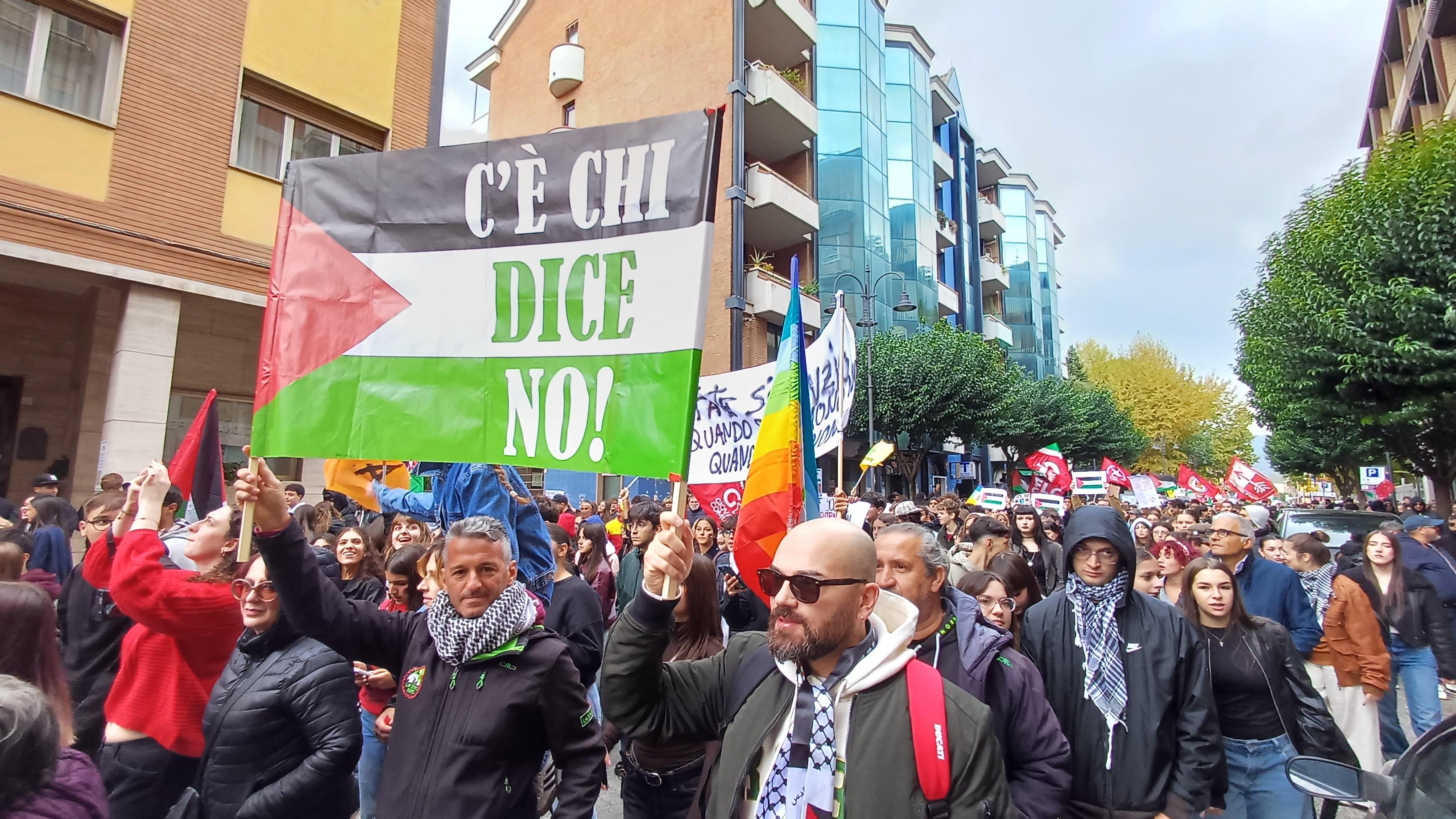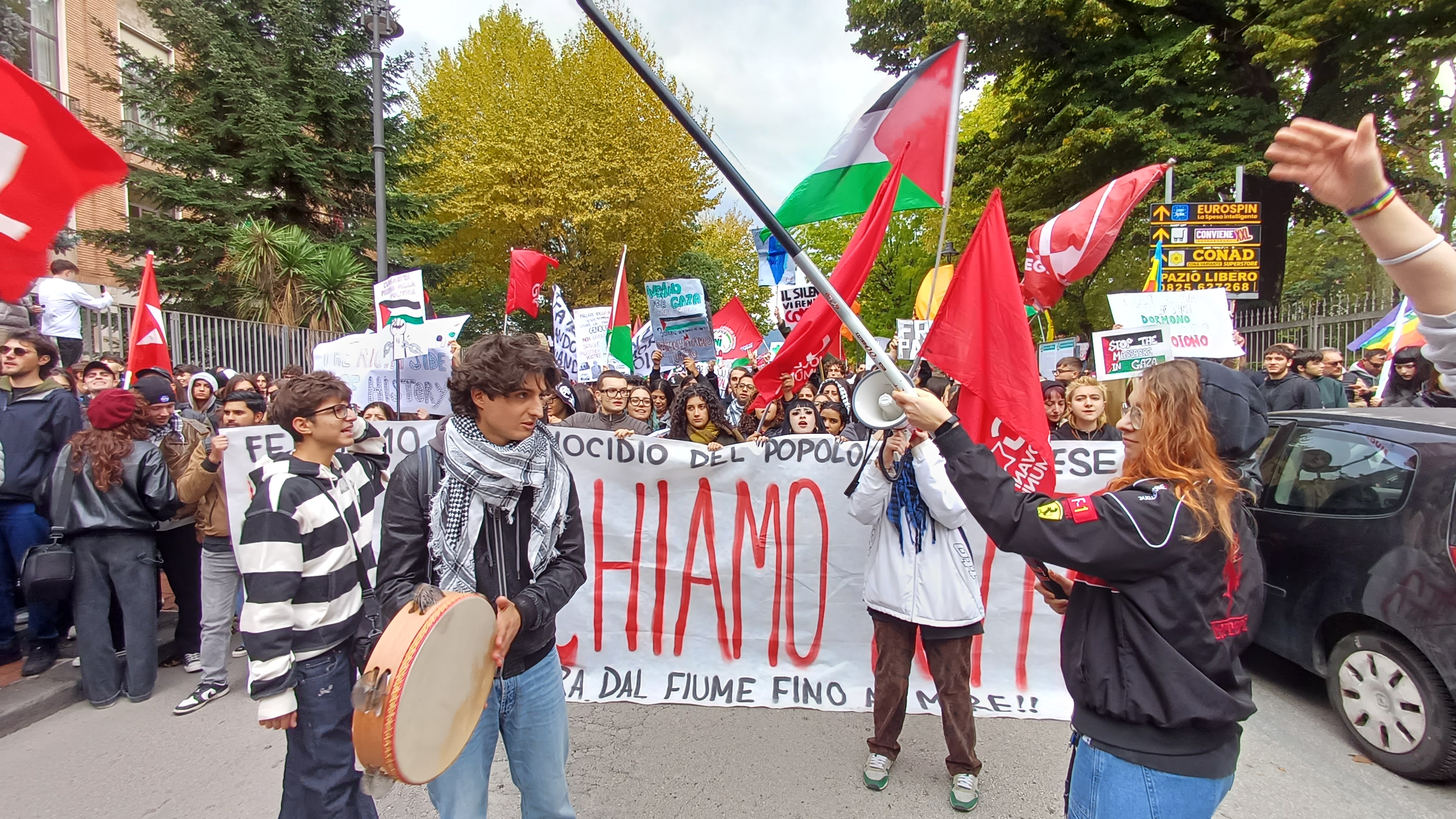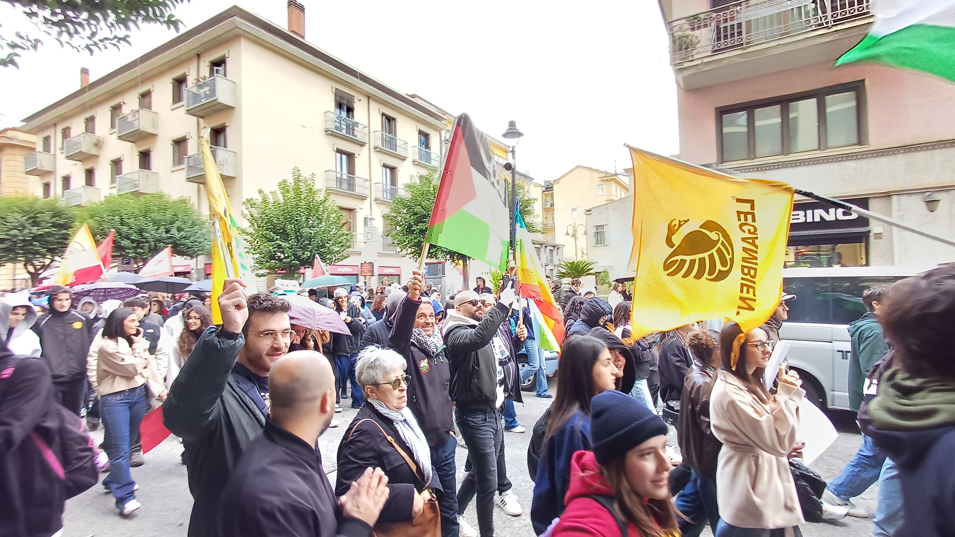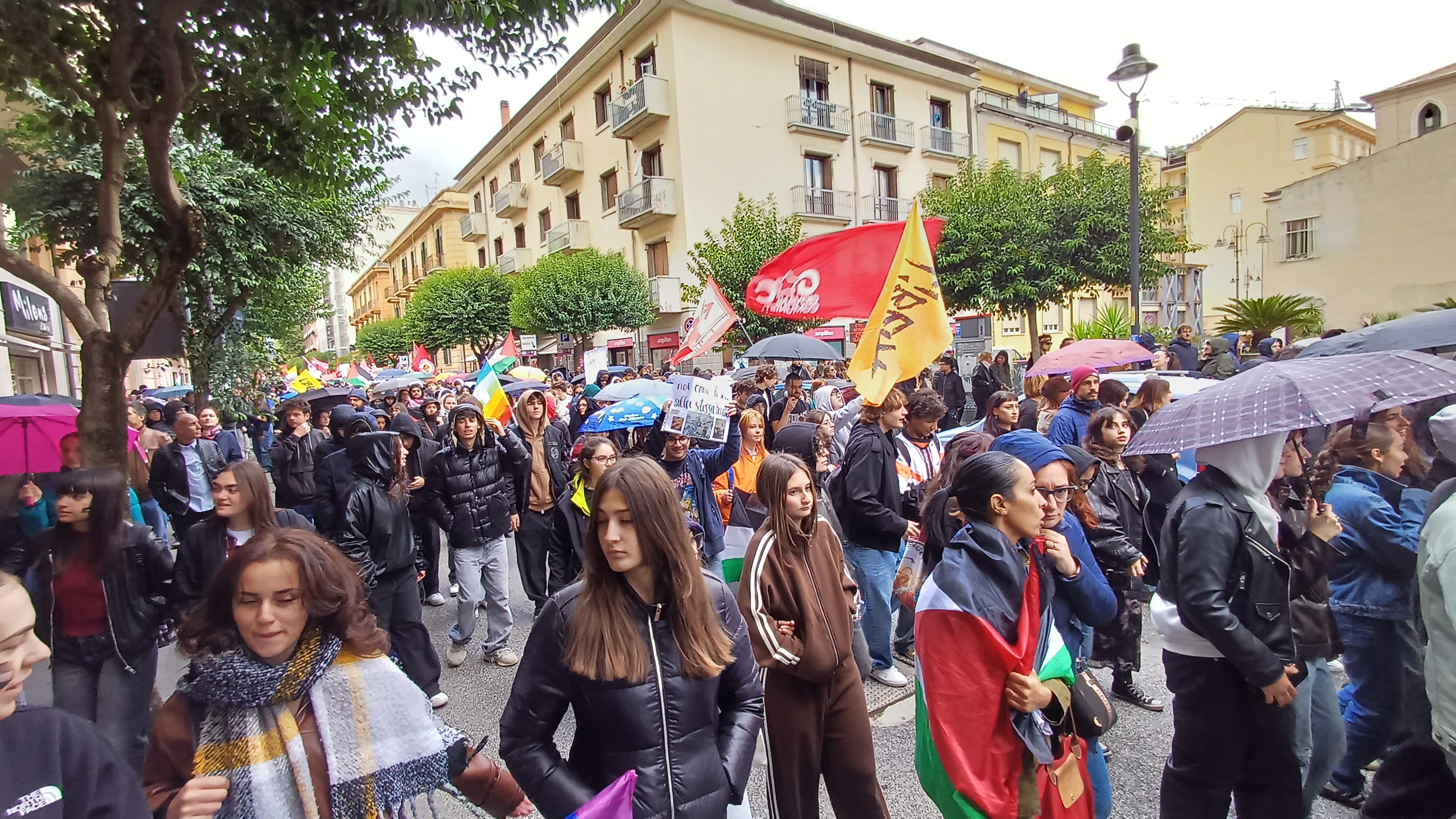 “Questa piazza è un pezzo di Gaza”. Sono le parole che risuonano lungo il corteo, insieme alle note di Bella Ciao, per ricordare ai potenti del mondo che Gaza resiste e la Palestina esiste, per essere al fianco di chi, come i volontari della flotilla, ha avuto il coraggio di non restare in silenzio. A sfilare, decisi a “bloccare tutto” perchè è l’unica soluzione possibile, non è solo il mondo della scuola con studenti e insegnanti, ci sono genitori e figli, lavoratori di tutti i settori, operai, medici, avvocati, associazioni, giovani e meno giovani in un abbraccio che è per Gaza, per gli attivisti arrestati, per i palestinesi che continuano ad essere decimati dalla carestia. Sono quasi duemila.”Le nostre manifestazioni nelle piazze non sono state inutili. – spiega Luca Cioffi di Arci – Abbiamo messo con le spalle al muro i governi. Non sappiamo ancora quando ritorneranno a casa i volontari, fermati malgrado le leggi del diritto internazionale diano loro ragione ma sappiamo che siamo qui anche per difendere il diritto di sciopero, messo in discussione dal governo Meloni. L’unico modo che abbiamo per far sentire la nostra voce è stare nelle piazze. Intanto, abbiamo consegnato un documento in Prefettura, chiedendo al governo italiano di smettere di finanziare l’economia del genocidio. L’imbarazzo dei nostri governanti è palese. Poche persone su delle barchette a vela si sono opposti al sistema, dimostrando come sia in atto il tentativo di sterminare la popolazione palestinese e quanto il diritto internazionale sia inutile se funziona solo a giorni alterni. Altrimenti a prevalere sarà sempre la legge del più forte”.