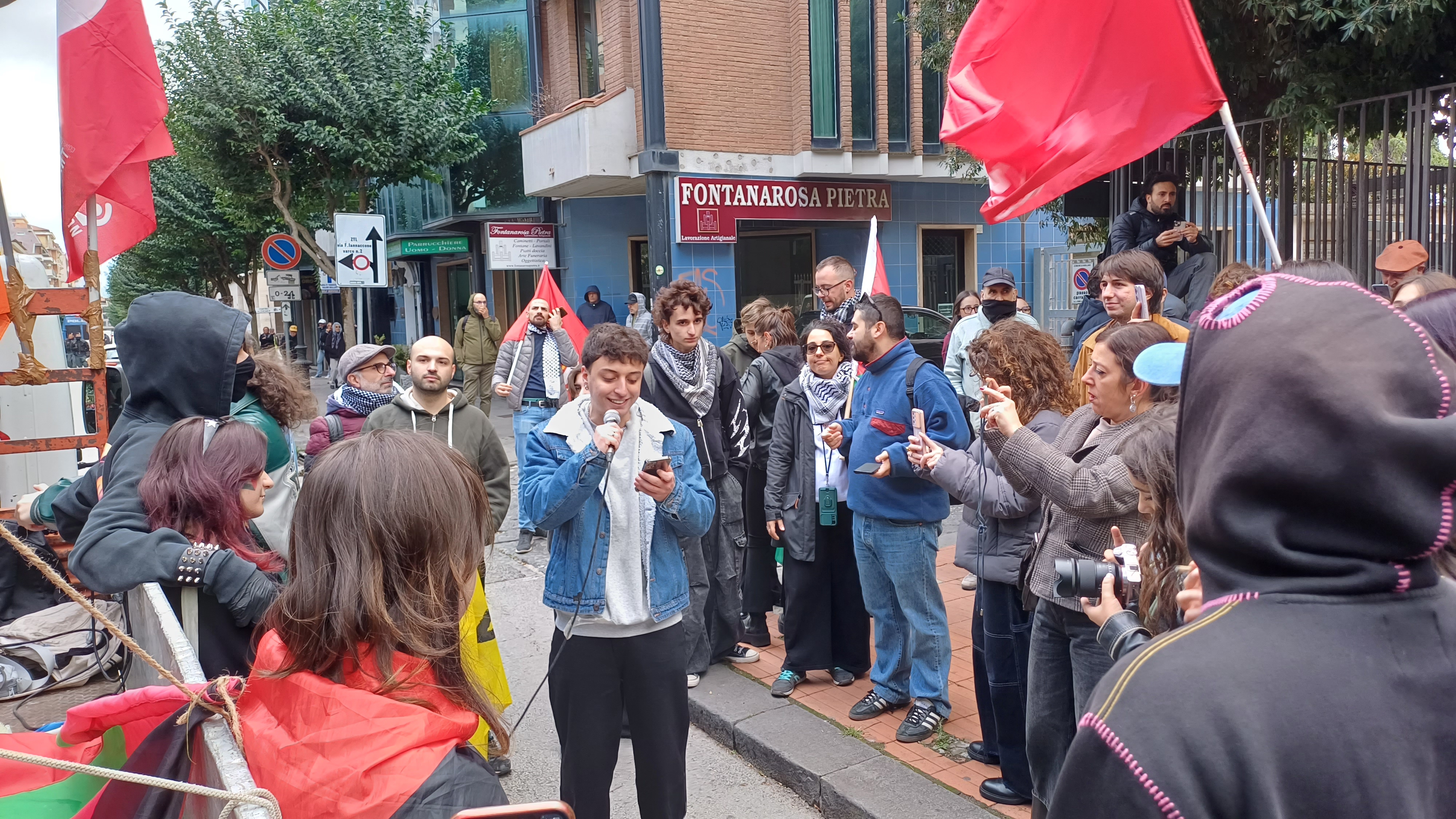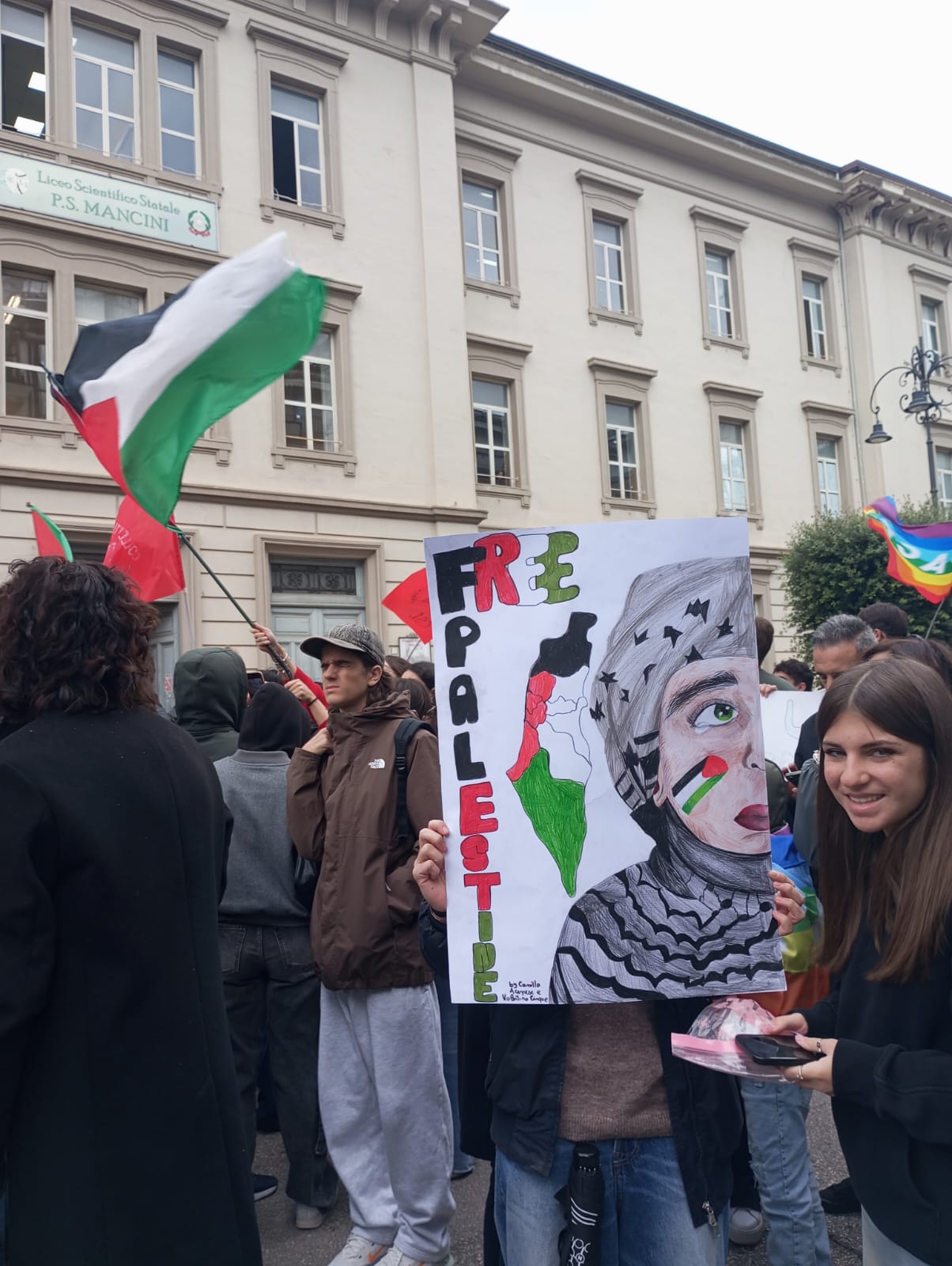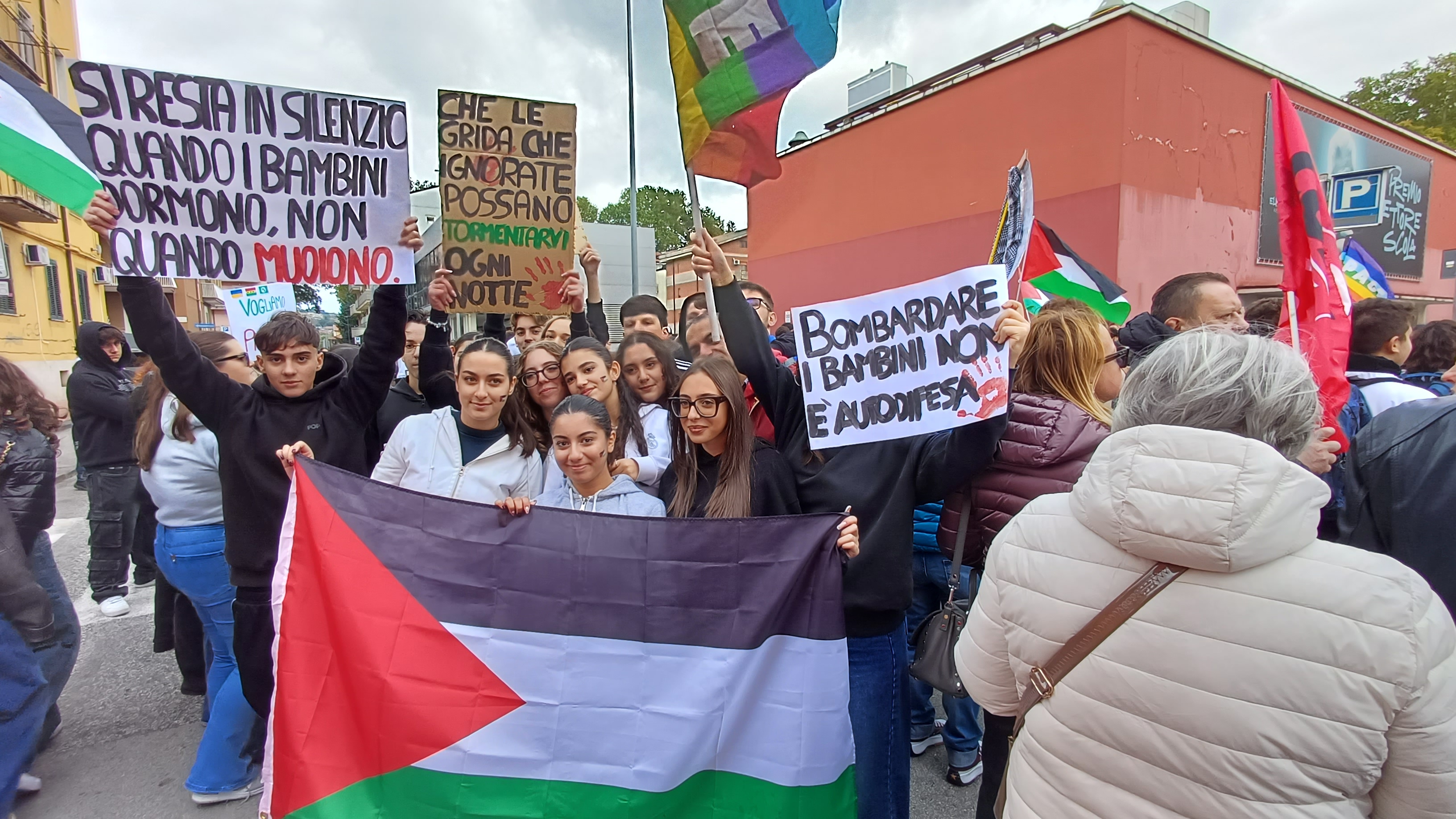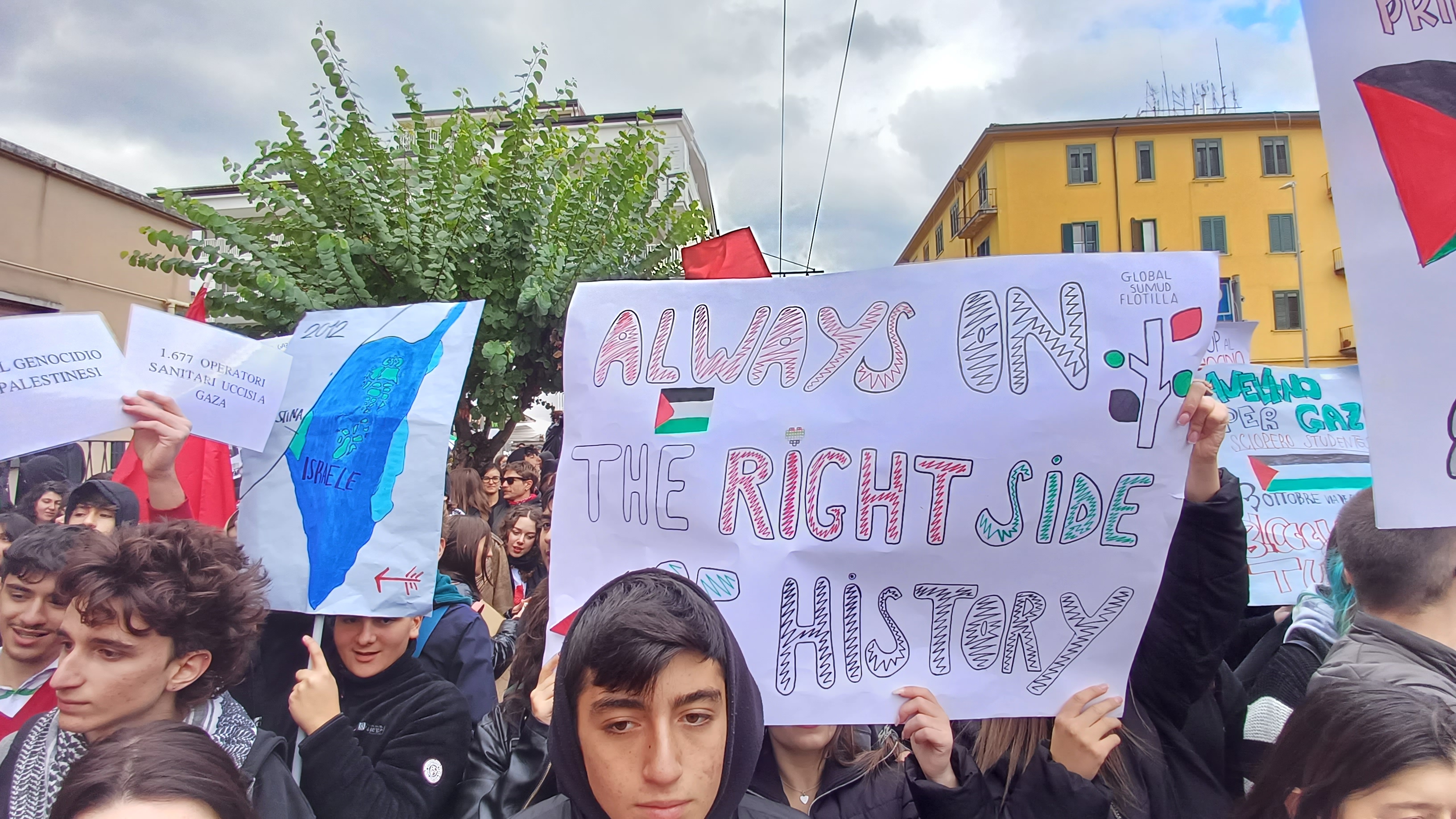 “Questa piazza è un pezzo di Gaza”. Sono le parole che risuonano lungo il corteo, insieme alle note di Bella Ciao, per ricordare ai potenti del mondo che Gaza resiste e la Palestina esiste, per essere al fianco di chi, come i volontari della flotilla, ha avuto il coraggio di non restare in silenzio. A sfilare, decisi a “bloccare tutto” perchè è l’unica soluzione possibile, non è solo il mondo della scuola con studenti e insegnanti, ci sono genitori e figli, lavoratori di tutti i settori, operai, medici, avvocati, associazioni, giovani e meno giovani in un abbraccio che è per Gaza, per gli attivisti arrestati, per i palestinesi che continuano ad essere decimati dalla carestia. Sono quasi duemila.”Le nostre manifestazioni nelle piazze non sono state inutili. – spiega Luca Cioffi di Arci – Abbiamo messo con le spalle al muro i governi. Non sappiamo ancora quando ritorneranno a casa i volontari, fermati malgrado le leggi del diritto internazionale diano loro ragione ma sappiamo che siamo qui anche per difendere il diritto di sciopero, messo in discussione dal governo Meloni. L’unico modo che abbiamo per far sentire la nostra voce è stare nelle piazze. Intanto, abbiamo consegnato un documento in Prefettura, chiedendo al governo italiano di smettere di finanziare l’economia del genocidio. L’imbarazzo dei nostri governanti è palese. Poche persone su delle barchette a vela si sono opposti al sistema, dimostrando come sia in atto il tentativo di sterminare la popolazione palestinese e quanto il diritto internazionale sia inutile se funziona solo a giorni alterni. Altrimenti a prevalere sarà sempre la legge del più forte”.