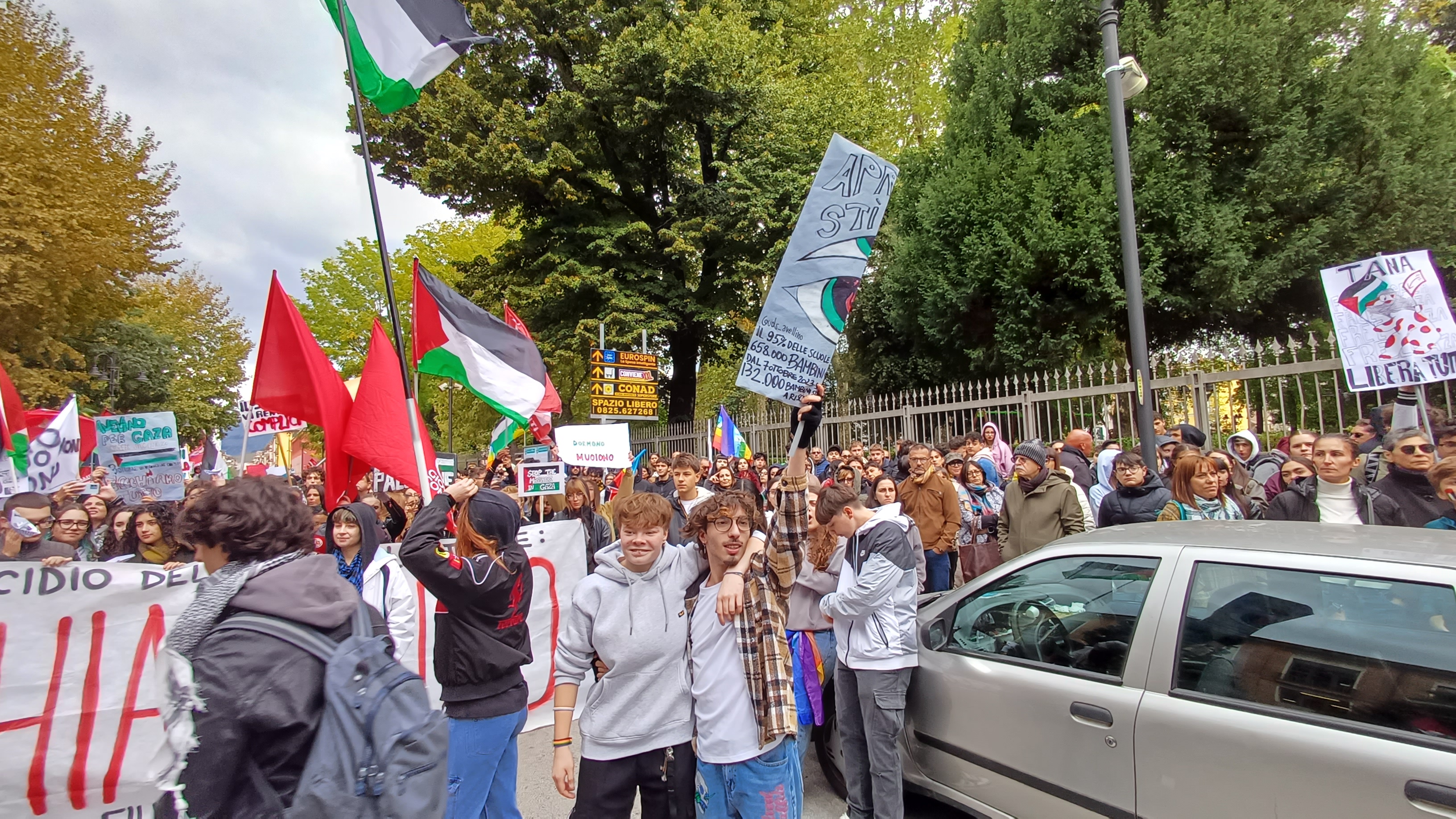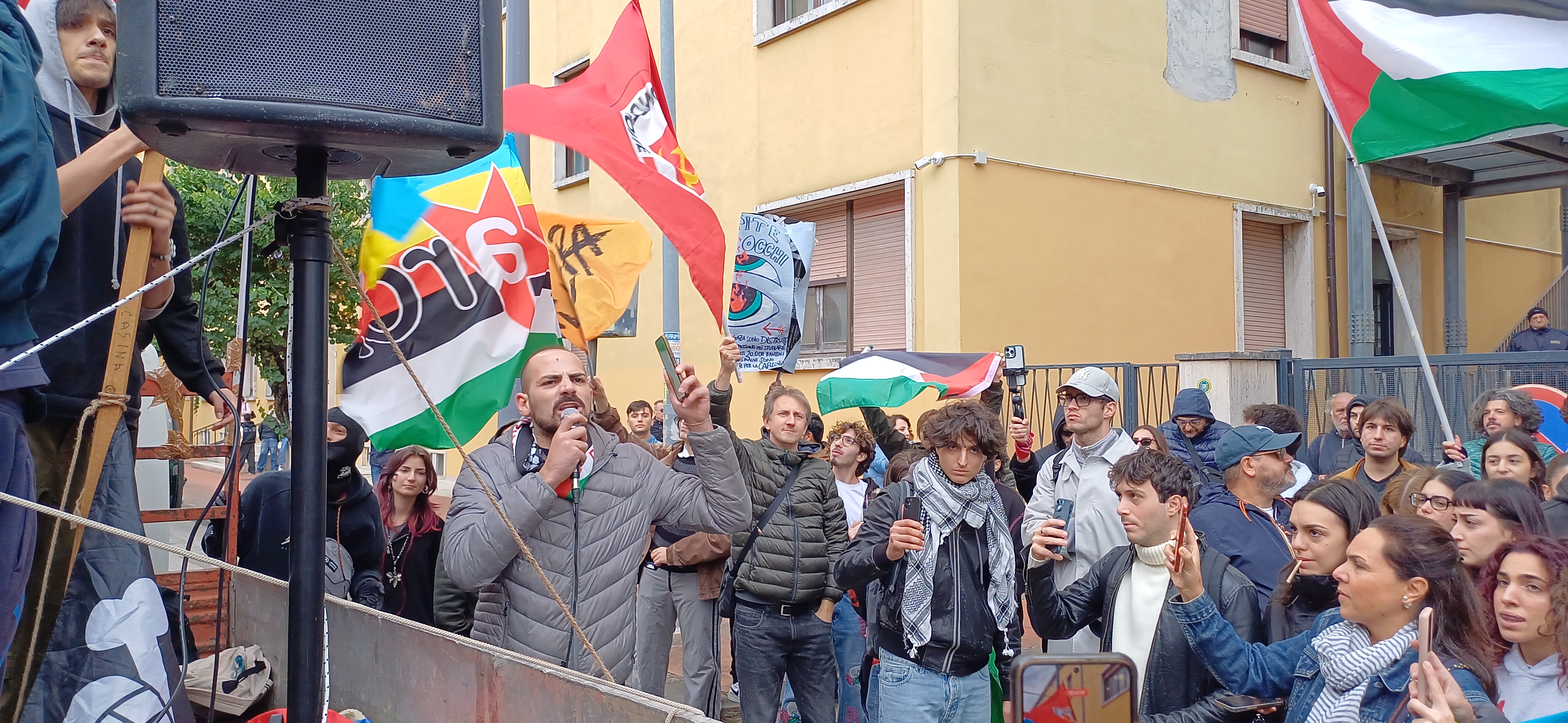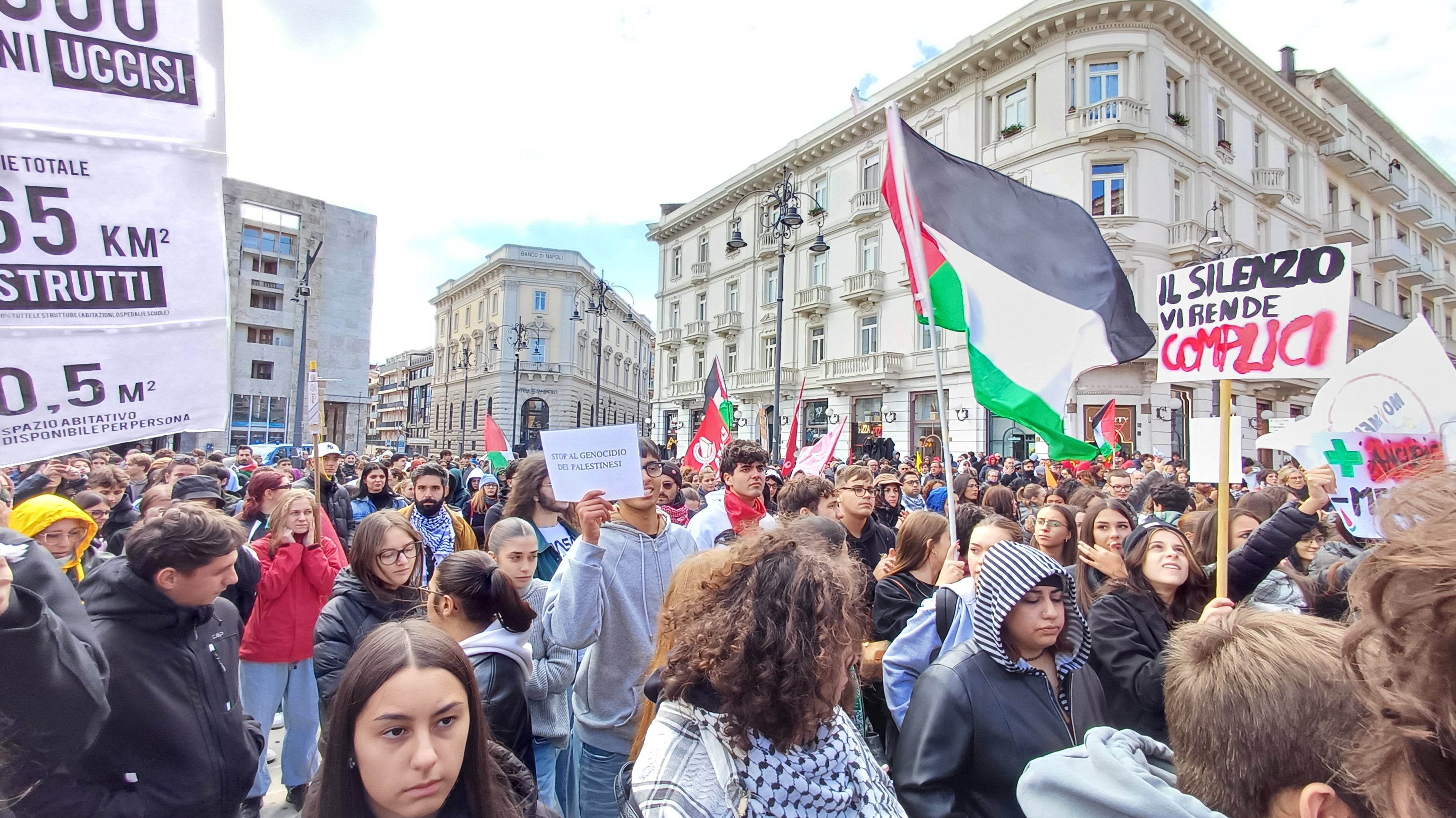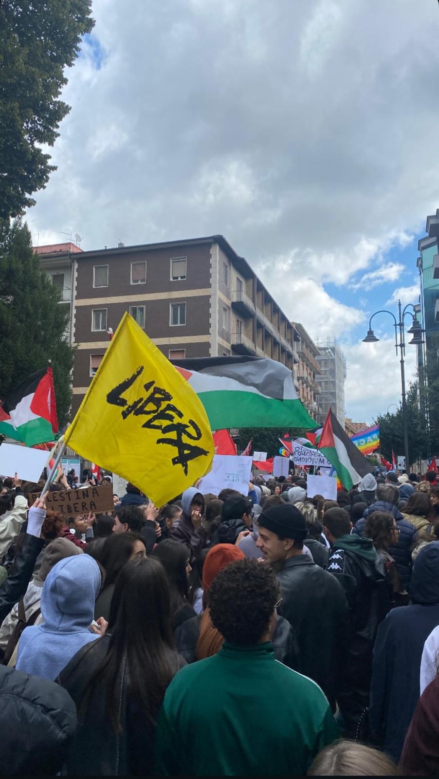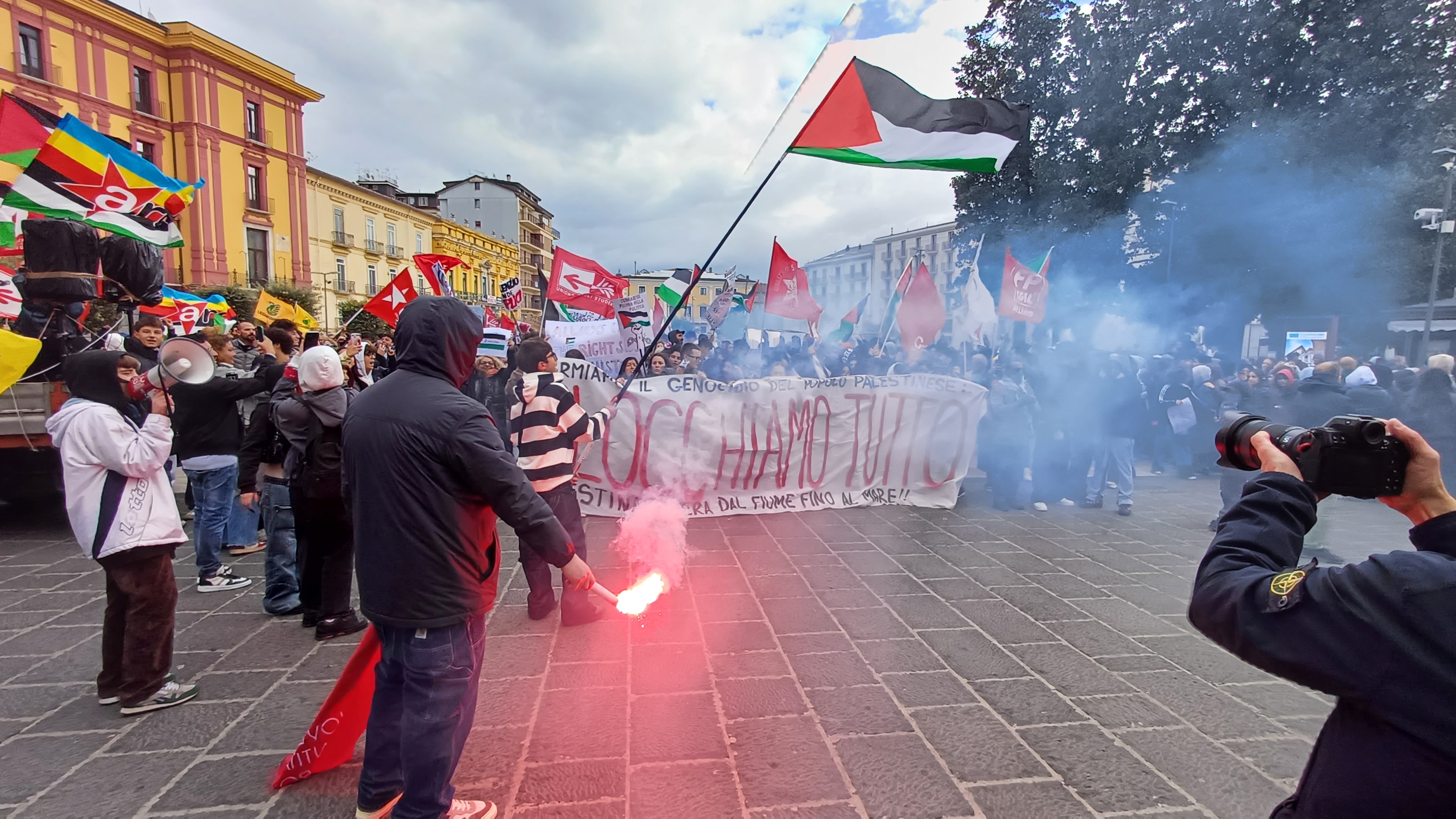 “Questa piazza è un pezzo di Gaza”. Sono le parole che risuonano lungo il corteo, insieme alle note di Bella Ciao, per ricordare ai potenti del mondo che Gaza resiste e la Palestina esiste, per essere al fianco di chi, come i volontari della flotilla, ha avuto il coraggio di non restare in silenzio. A sfilare, decisi a “bloccare tutto” perchè è l’unica soluzione possibile, non è solo il mondo della scuola con studenti e insegnanti, ci sono genitori e figli, lavoratori di tutti i settori, operai, medici, avvocati, associazioni, giovani e meno giovani in un abbraccio che è per Gaza, per gli attivisti arrestati, per i palestinesi che continuano ad essere decimati dalla carestia. Sono quasi duemila.”Le nostre manifestazioni nelle piazze non sono state inutili. – spiega Luca Cioffi di Arci – Abbiamo messo con le spalle al muro i governi. Non sappiamo ancora quando ritorneranno a casa i volontari, fermati malgrado le leggi del diritto internazionale diano loro ragione ma sappiamo che siamo qui anche per difendere il diritto di sciopero, messo in discussione dal governo Meloni. L’unico modo che abbiamo per far sentire la nostra voce è stare nelle piazze. Intanto, abbiamo consegnato un documento in Prefettura, chiedendo al governo italiano di smettere di finanziare l’economia del genocidio. L’imbarazzo dei nostri governanti è palese. Poche persone su delle barchette a vela si sono opposti al sistema, dimostrando come sia in atto il tentativo di sterminare la popolazione palestinese e quanto il diritto internazionale sia inutile se funziona solo a giorni alterni. Altrimenti a prevalere sarà sempre la legge del più forte”.