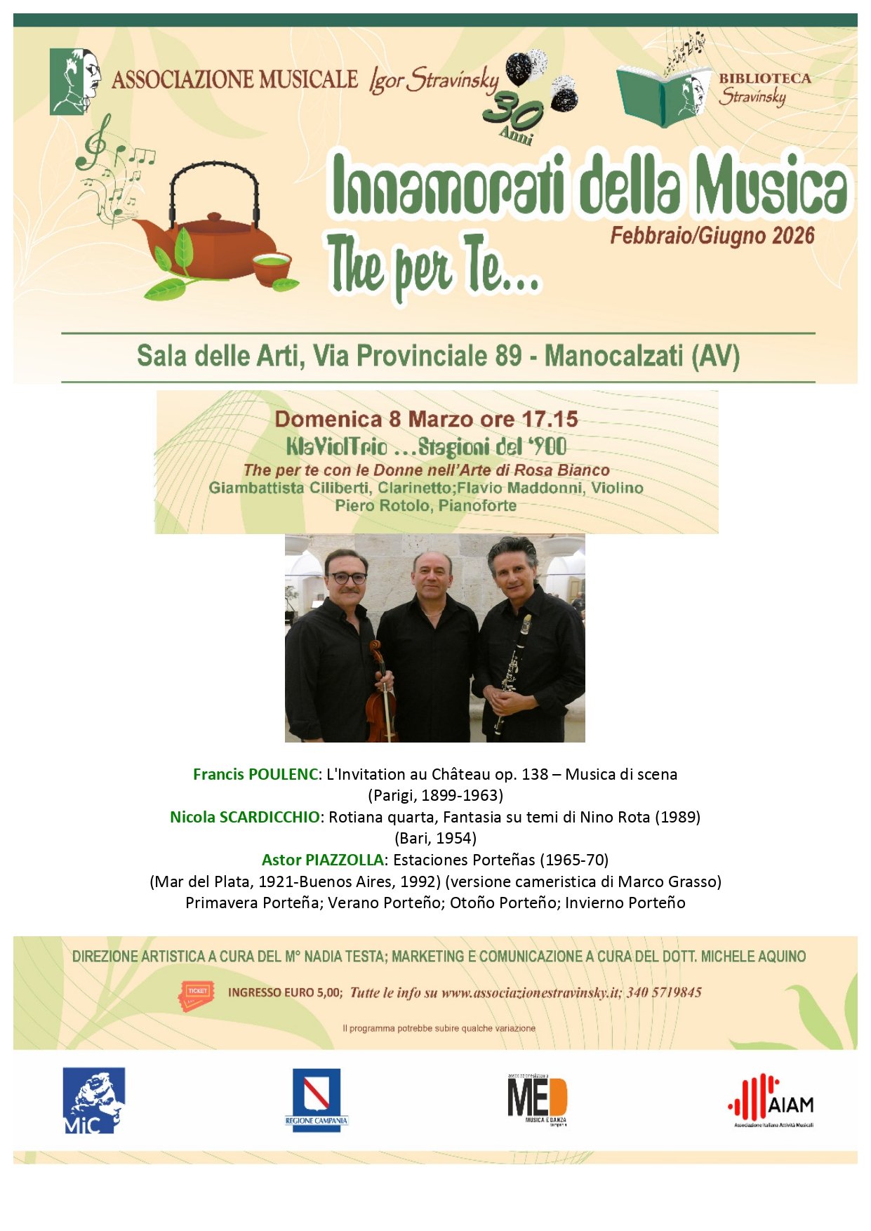 Domenica 8 marzo alle ore 17.15 nella Sala delle Arti a Manocalzati, l’Associazione Igor Stravinsky nell’ambito della rassegna Innamorati della Musica 2026 proporrà il concerto dal titolo “KlaViolTrio…Stagioni del ‘900” con Giambattista Ciliberti al Clarinetto, Flavio Maddonni al Violino e Piero Rotolo al Pianoforte.